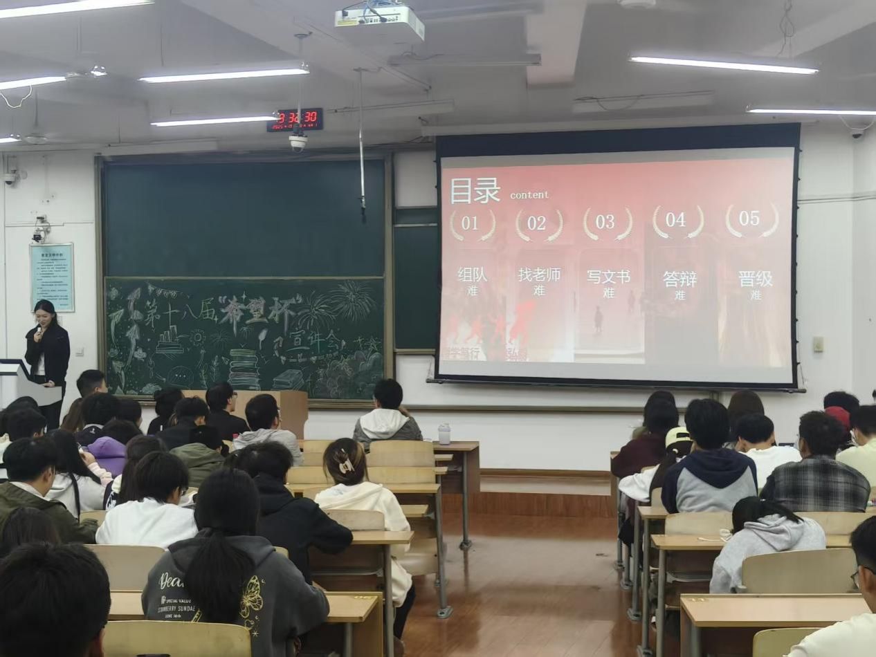 宣讲中,她以“五难”:组队难、找老师难、写文书难、答辩难、晋级难入手,直击学生痛点,瞬间拉近了与听众们的距离。随后,她针对每一个“难”点,都给出了清晰的“破题”思路。这番讲解,如同为同学们描绘了一幅清晰的“闯关”蓝图,让曾经的“拦路虎”变成了可逐个击破的“纸老虎”,给同学们吃了一颗“定心丸”。