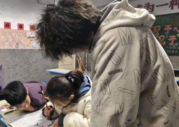 与此同时,在另一间教室里,墨香四溢,惠晨津和屠晓璐带来的毛笔书法课同样吸引了众多孩子。两位“小老师”从最基本的执笔、坐姿教起,带领孩子们领略中华传统书法艺术的魅力。屠晓璐用生动有趣的故事讲解了汉字的起源和书法的历史,让孩子们对这门古老艺术有了初步的认识。惠晨津则穿梭于课桌之间,进行一对一的指导,手把手地帮助孩子们纠正握笔姿势,练习“横、竖、撇、捺”等基本笔画。孩子们聚精会神,在宣纸上认真临摹,虽然笔触尚显稚嫩,但每一笔都饱含着对传统文化的好奇与敬重。