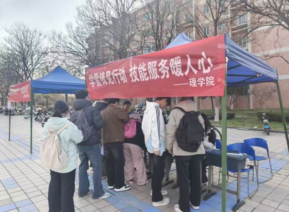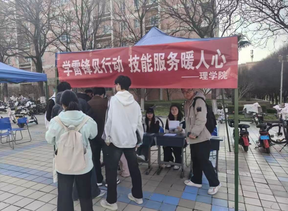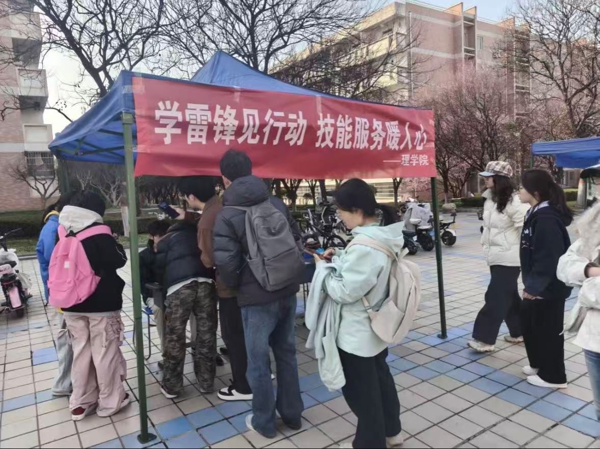3月5日,理学院团委在学校中心广场开展了主题为“学雷锋见行动,技能服务暖人心”的义务维修活动,把课堂所学转化为便民服务的实际行动,让雷锋精神在校园里落地生根。