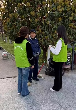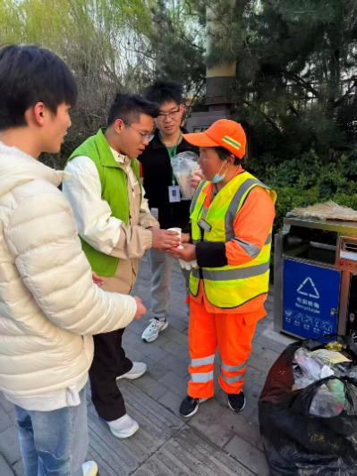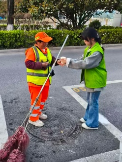 随后,志愿者们分成三个小组,分别走进校园、学校周边街区及华清池景区,第一小组驻守校园,为教学楼、食堂、主干道等岗位的保洁人员送上热水与手套,以暖心问候致敬默默奉献的校园守护者。第二小组走进学校周边街区,为寒风中坚守一线的环卫工人递上热水、戴上手套,感谢他们为城市环境付出的辛劳。第三小组前往华清池景区,在周边及主要道路为景区环卫工人送去热水的同时,并主动协助清理路面杂物,以实际行动传递关怀,展现出西工程大学子的责任与担当。