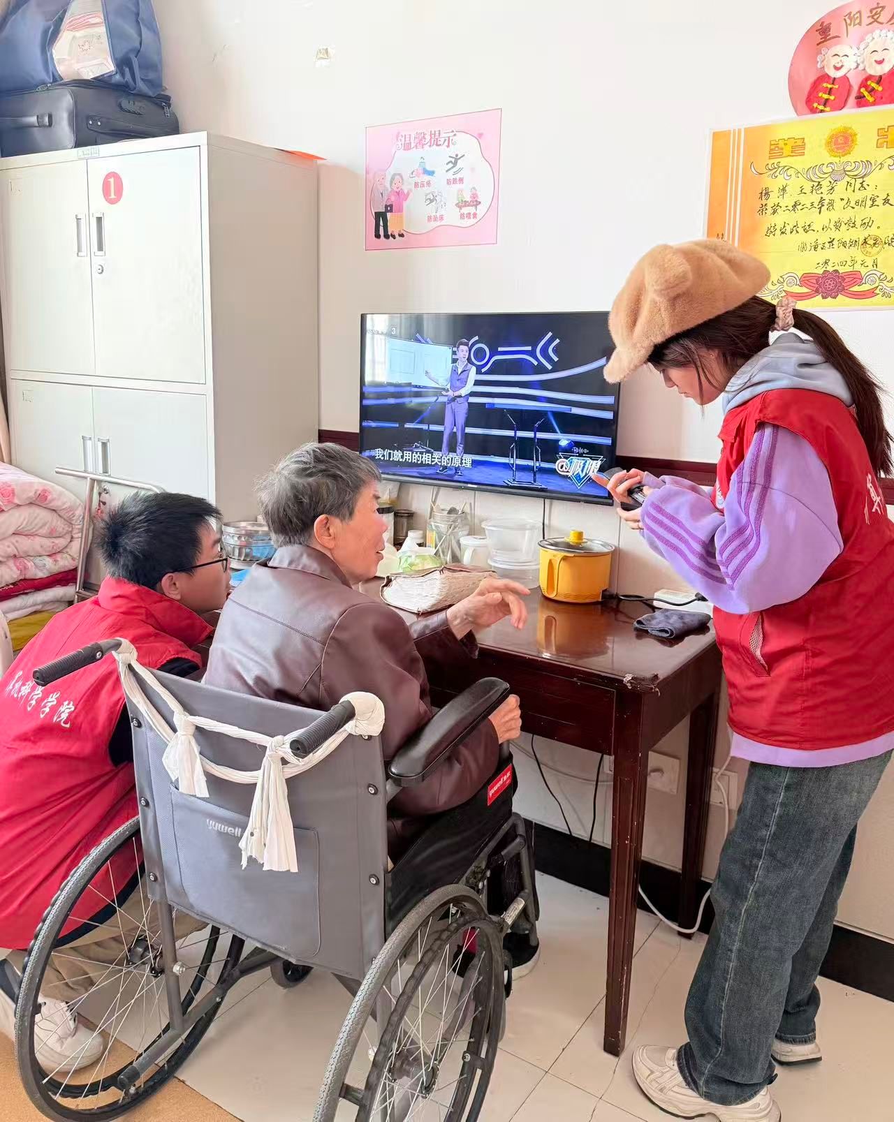 “IT智能帮・银龄时光守护计划”是学院的一项品牌志愿服务活动。身着红色志愿马甲的志愿者们以雷锋同志为榜样,热情满满投入各项服务。他们或悉心搀扶行动不便的老人,协助推送轮椅、乘坐电梯、开门引路;或围坐老人身旁,陪老人闲话家常、看电视,倾听老人们讲述生活趣事与心声;或与老人一起做漆扇手工绘制,在互动创作中为老人带来别样的精神享受。他们还充分发挥计算机专业优势,手把手教老人使用智能手机,耐心讲解视频通话、浏览资讯等实用操作,为老人拍摄照片和视频,并修复一些有纪念意义的老照片,帮助老人们跨越“数字鸿沟”,享受智能科技带来的便利和精神食粮。养老院里处处洋溢着欢声笑语。