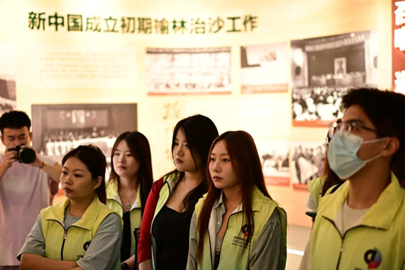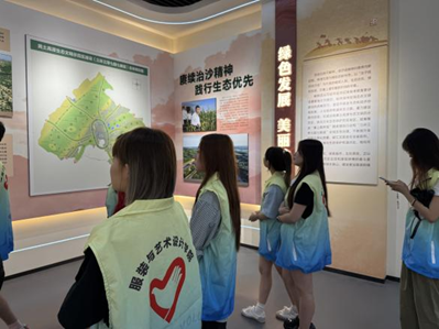 实践队聚焦“生态治理”与“数字创新”,感受榆林乡村的新时代活力。7月21日在补浪河女子民兵治沙连展览馆内,1974 年 54 名女民兵在荒漠播绿的故事震撼了队员。近半个世纪,她们创造了“绿进沙退”的奇迹,如今的“三环三带七园七廊道”模式,使治沙成果成为红色教育与生态旅游综合体。这一案例不仅展现了生态治理的成果,更引发了队员对青春价值的深刻思考,激励着他们为生态环保事业贡献自己的力量。
