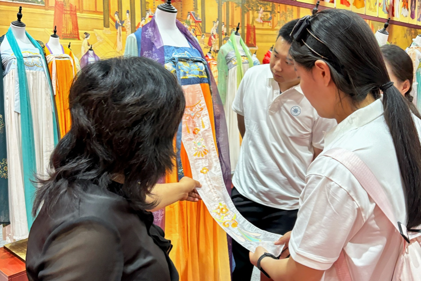 实践队首站走进咸阳乾县雅尔艾汉服基地。同学们带着问题仔细参观,穿行于陈列着唐制齐胸襦裙、宋制褙子、明制马面裙等多朝代服饰的展区,认真观察每一件汉服的设计细节。负责人坦言,汉服市场扩大的同时,抄袭设计、以次充好等侵权行为损害原创品牌,且西安线上线下市场差异明显——线上侵权屡禁不止,线下实体店重原创却面临推广难题,同学们详细询问了侵权特征与企业应对措施。