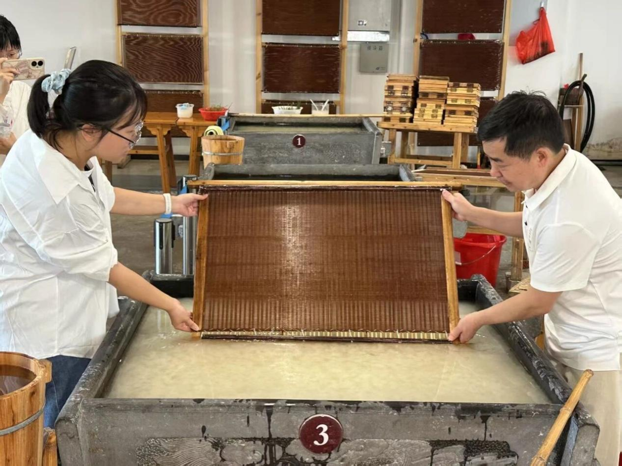 实践首站抵达中国宣纸文化园。在“纸寿千年”的独特氛围中,队员们不仅惊叹于宣纸制作的精妙绝伦,更深刻领悟到宣纸作为建筑图样与历史文献重要载体的文化支撑作用。一张薄纸,承载着从设计蓝图到营造法则的厚重历史,成为理解中国古建筑中和谐共生哲学与工匠精神的独特窗口。实践团成员们深入博物馆并采访非遗大师,总结文化结合数媒传播的关键点。