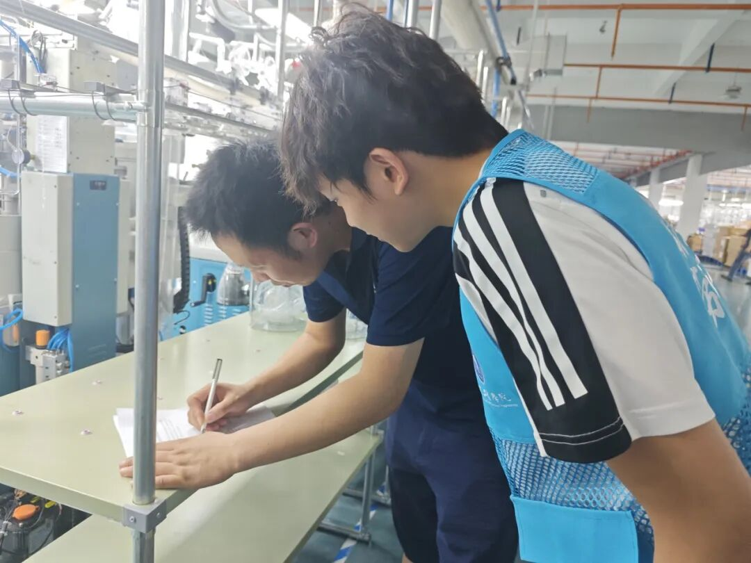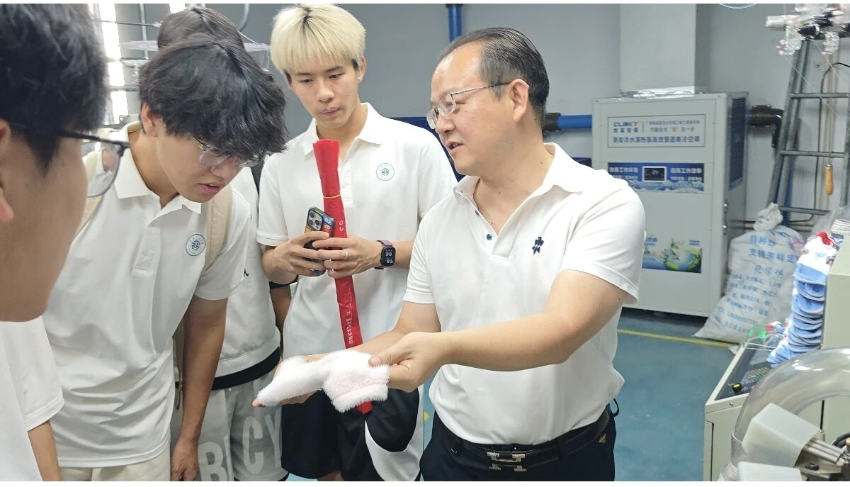 实践活动首站,团队成员赴安康安瑞智能制造有限责任公司。在学校驻企业的技术专家张团善教授的带领下,学生们参观了该公司与学校合作的重点项目“智能化袜业织造产业链项目”的智能化生产车间,各式各样融入科技元素的袜子琳琅满目,令学生们目不暇接。实践团成员不仅为这些高技术智能化生产线所吸引,更是对学校助力企业绿色发展和产业转型升级的创新举措纷纷点赞。部分成员兴致勃勃地参与实践操作环节,在专业技术人员的指导下操作起智能化袜机设备。从调试参数、安装纱线,到启动机器,每一个步骤都细致操作,随着机器的运转,一双双袜子便新鲜“出炉”。在座谈会上,企业负责人为实践队成员详细介绍了企业的发展历程以及在生产中的相关技术瓶颈,鼓励学生在校要学习“真本领”,进入社会才能拿出“真本事”,为国家、社会、行业发展贡献青春力量。随后,实践团队针对生产车间的管理人员及技术工人,通过“访谈+填答”的形式,与一线产业工人展开深度交流。在了解语言使用现状的过程中,系统收集了工人在日常工作沟通、技术术语表达中的语言习惯,为后续制定精准推普方案积累了详实的数据支撑。