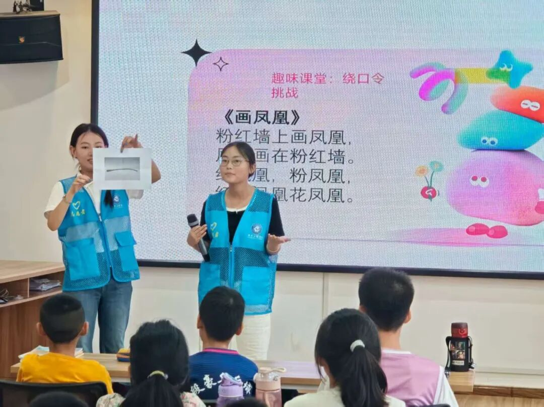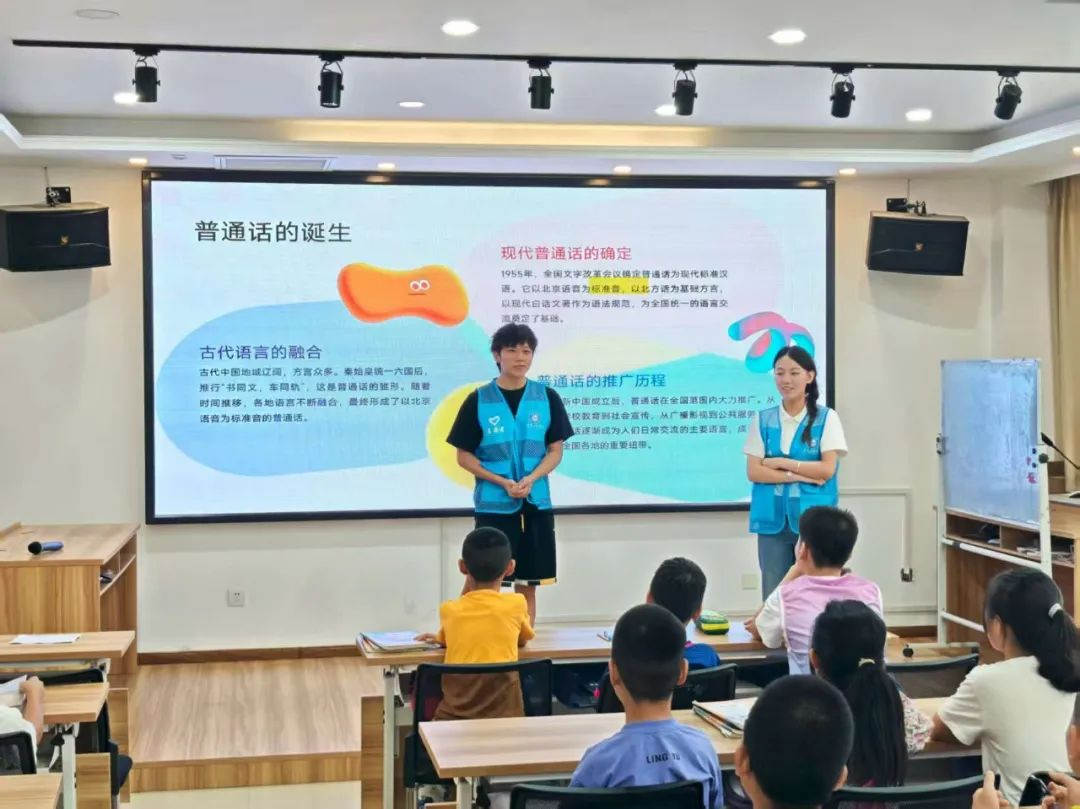 此外,实践队还参加了西安市临潼区“七彩假期”志愿服务活动,在社区内,实践团队为参加社区暑假托管的小朋友们带来了一堂别开生面的“推广普通话・快乐学说话”社区小课堂。课堂通过讲述普通话的诞生历程、分享因方言引发的有趣误会、组织趣味小游戏以及设置“小小播音员”等环节,让孩子们在轻松愉快的氛围中感受普通话的魅力,度过了一个充实又生动的假期课堂时光。社区小课堂不仅激发了孩子们对普通话的兴趣,也为实践团队后续在乡村开展推广工作积累了宝贵经验,为下一阶段的实践活动筑牢了基础。