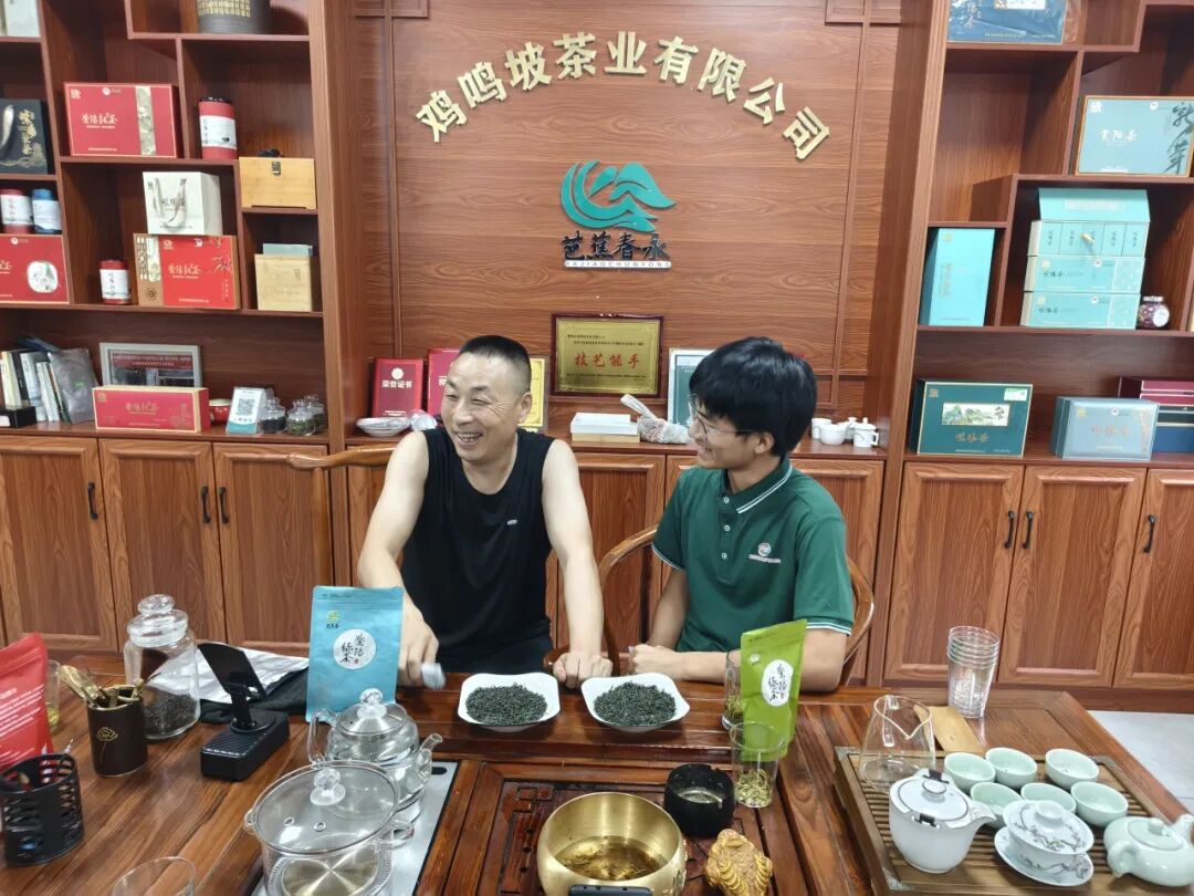 实践第二站,实践团抵达安康市紫阳县。在紫阳县,实践团走进高桥镇权河村山野食品有限公司。在公司总经理、紫阳县人大代表、紫阳县致富带头人周其书的详细讲解下,实践团系统学习了当地茶叶的生产加工流程。从鲜叶处理、杀青、揉捻、渥堆发酵、烘干到精选等全流程加工环节,每一步都透露着制茶人的匠心独运,也正是这份精益求精,成就了紫阳茶叶闻名全国的良好口碑。随后的座谈会上,周其书向实践团成员生动讲述了紫阳当地的风土人情、生活环境、核心产业及语言习惯等,让实践队员们收获颇丰,对当地有了更深入全面的认识。实践团成员还向公司提出建议,鼓励公司通过普通话直播带货,以拓宽销售渠道,团队成员现场演示了如何用标准普通话介绍紫阳茶叶及其他特色产品,并协助公司策划了线上推广方案,助力企业实现可持续发展。