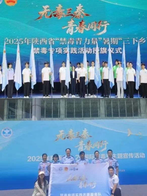 6月26日“‘毒’行睘睘”实践队学生代表前往陕西师范大学,参加了由陕西省禁毒委员会等单位联合主办的“无毒三秦、青春同行”2025年陕西省6.26国际禁毒日主题宣传活动及授旗仪式。活动中,队员康佳瑞作为志愿者代表庄重接过队旗,这一仪式宣告实践活动正式启动,也明晰了团队的责任与目标,为后续禁毒实践工作吹响“青春集结号”。
