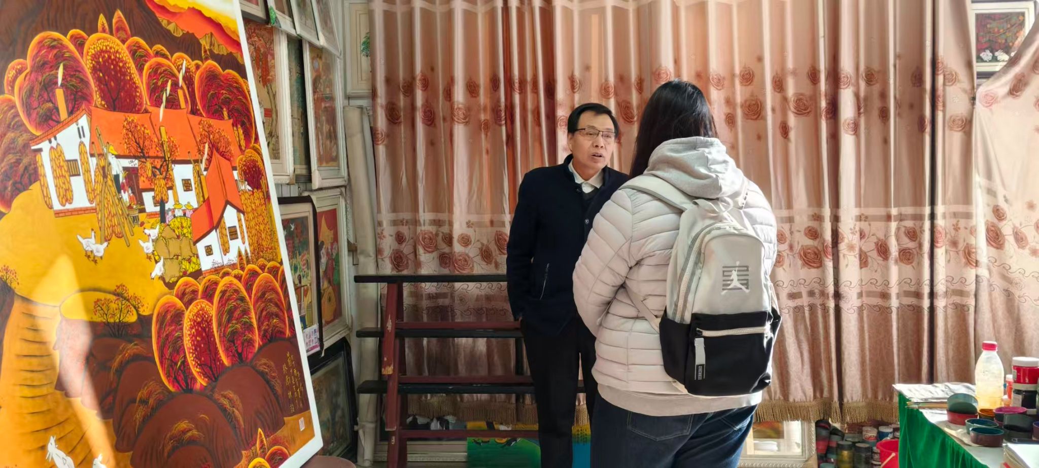 团队首站走访了位于画展街14号的农民画展馆与创作基地,初步领略了农民画的历史脉络与产业生态。随后,队员们专程拜访了东韩村的著名农民画画家王乃良先生。王先生结合自身数十年的创作历程,生动阐释了农民画的艺术特色、时代价值与现实困境,为调研提供了珍贵的一线视角。