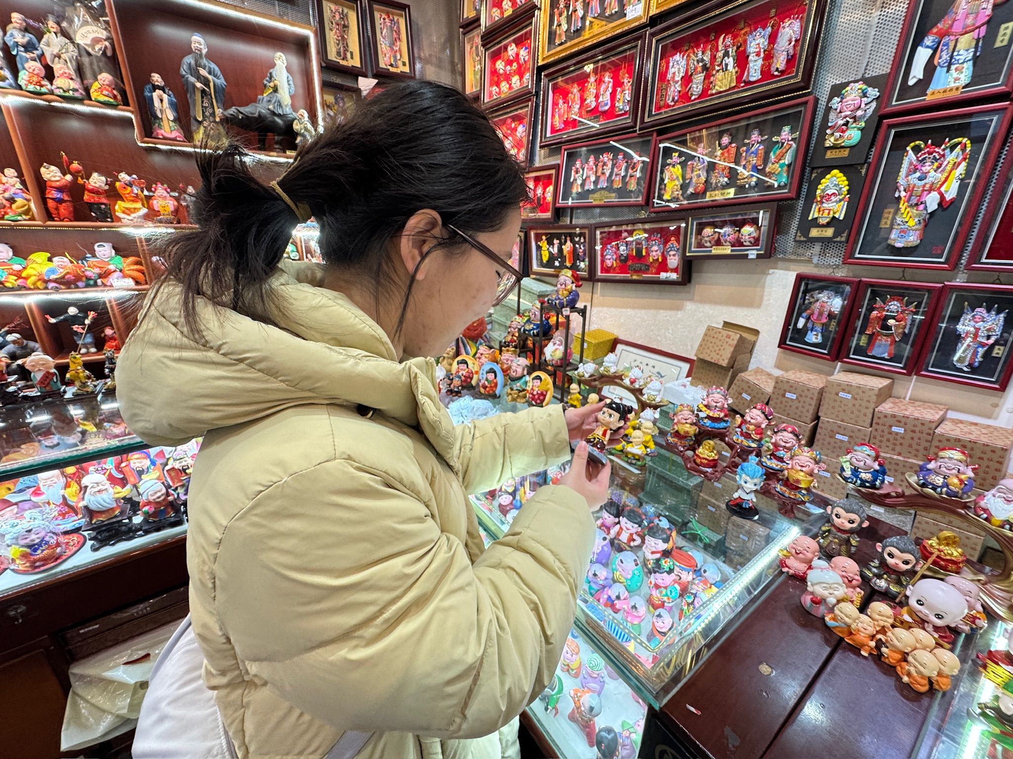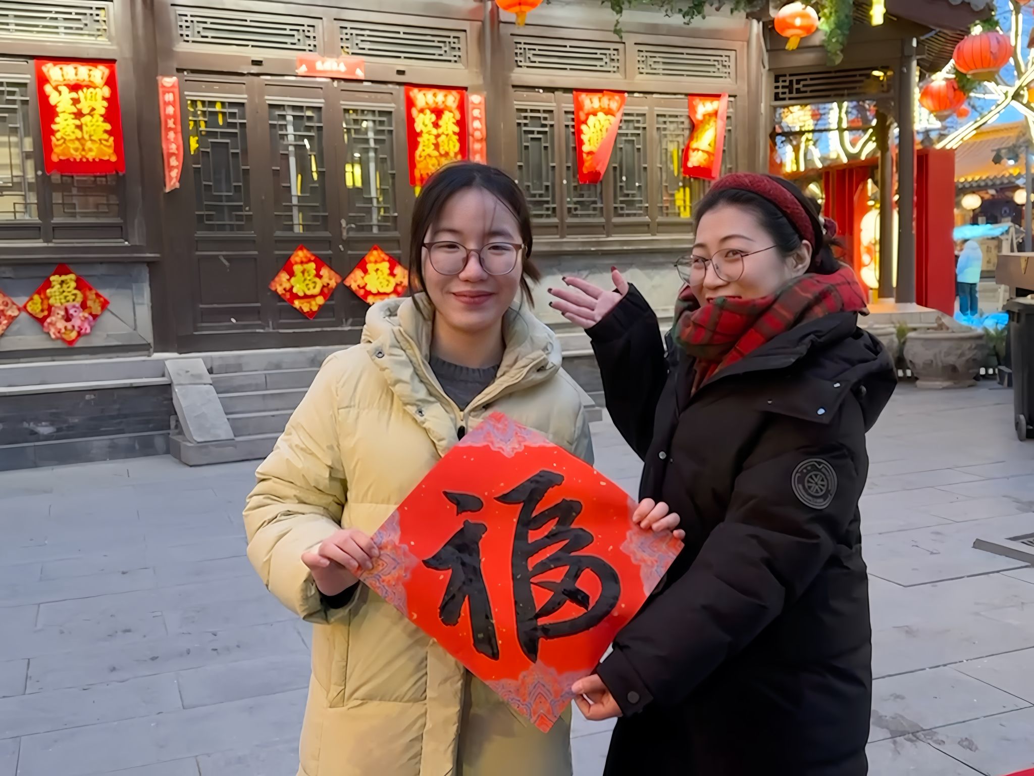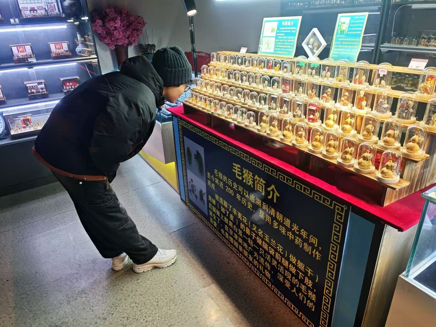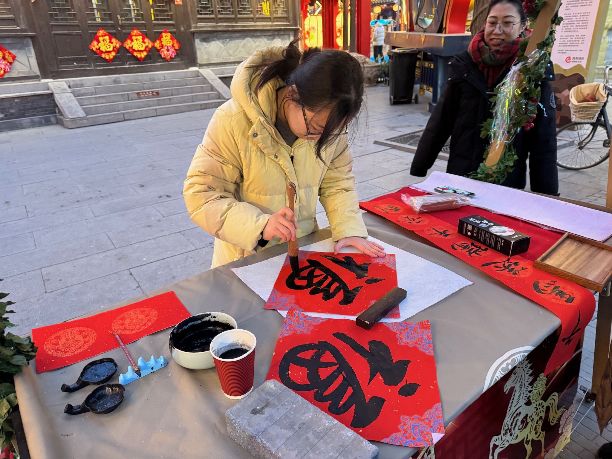 走进古镇的泥人轩工坊,另一番热闹景象映入眼帘。作为泥人张彩塑传承人,店长丁宝翠女士已在彩塑领域深耕三十余年。揉泥、塑形、精雕、彩绘,队员们循着她的指引,见证了将普通的泥土赋予鲜活生命力。在交谈中她提到:“泥人张的精髓不仅在‘形’,更在‘神’,要让泥土会说话。”随后,实践队探访了有着200年历史的毛猴技艺,了解这门以多味中药为原料的独特工艺,感叹老艺人化平凡为神奇的创造力。这些让队员们深刻体会到传统技艺“源于生活、高于生活”的智慧。此外,实践队还走进津门特色非遗场景:在相声茶馆里,听一段字正腔圆的津味相声,感受方言文化的幽默与魅力;在笔墨香中亲手书写春联,体悟汉字书法的线条之美。