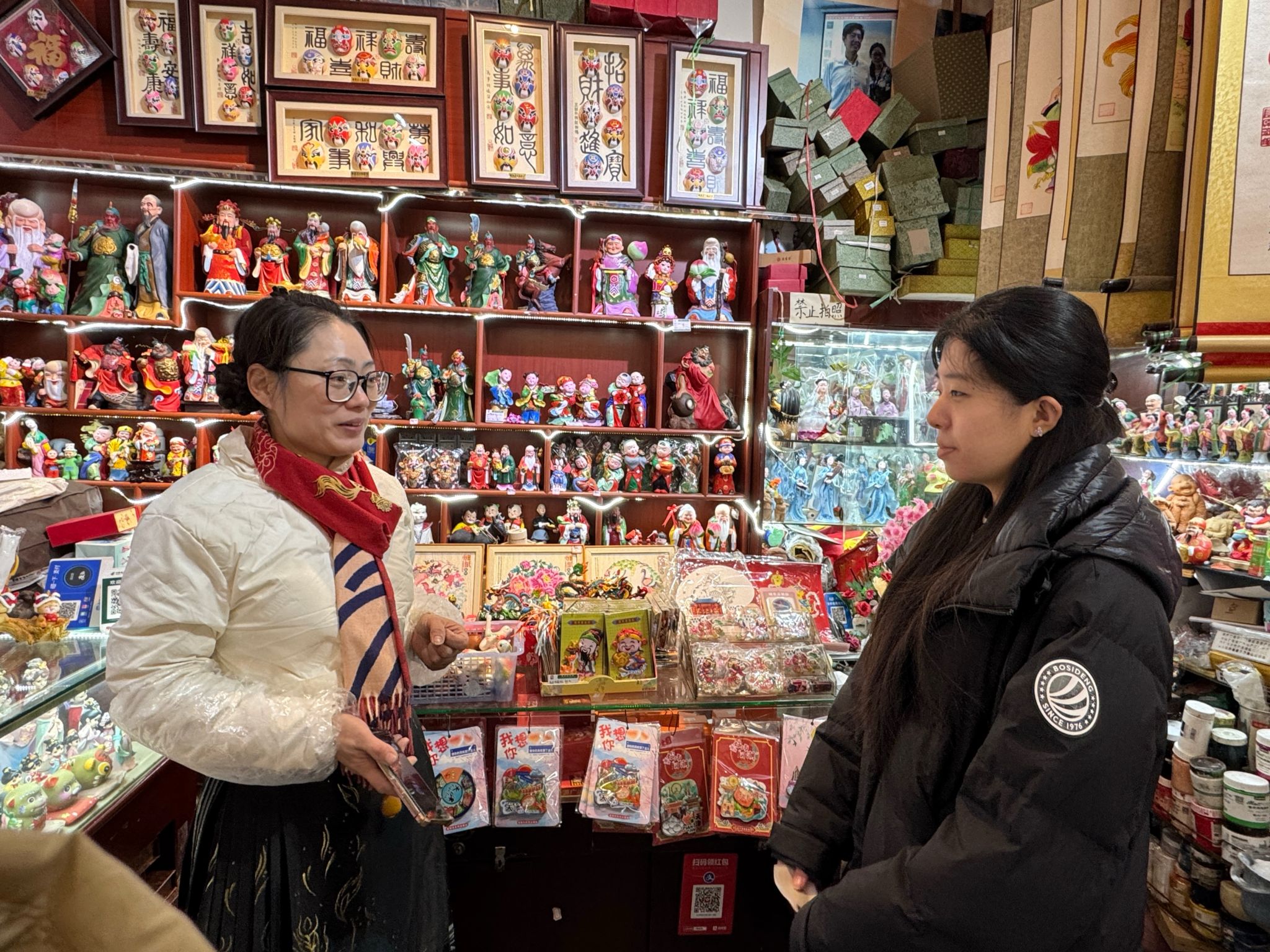 古今交融碰撞火花。实践队的旅程不止于技艺体验,更注重深度文化对话。观看非遗主题剧目《寻找白俊英》后,队员们与演员们交流,探讨非遗元素与现代舞台艺术的融合之道,思考如何让传统故事以更年轻的方式被看见、被喜爱。在与杨柳青年画、泥人张等非遗传承人的交谈中,队员们不仅记录下技艺的历史渊源、工艺流程,更聚焦“当代非遗如何活起来”这一核心问题。传承人们分享了非遗进校园、线上直播展示、文创产品开发等创新尝试,队员们则结合青年视角,提出短视频传播、校园非遗社团建设等建议,古今智慧的碰撞,为非遗传承注入新思路。