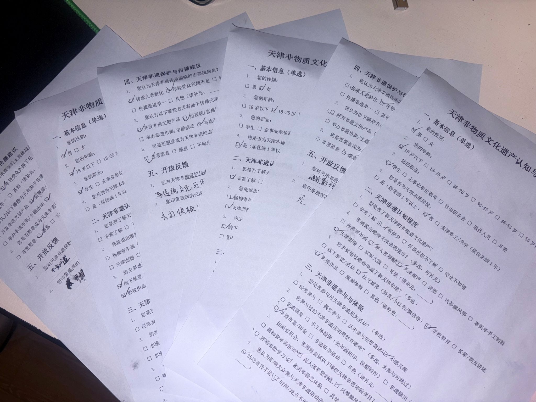 为了解大众对天津非遗的认知现状,实践队还在古文化街、五大道等景区开展问卷调查,与游客、市民深入交流。调查发现,年轻群体对非遗的兴趣浓厚,但了解渠道相对有限,这也让实践队更加坚定了“传播非遗、推广非遗”的责任与使命。