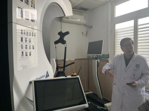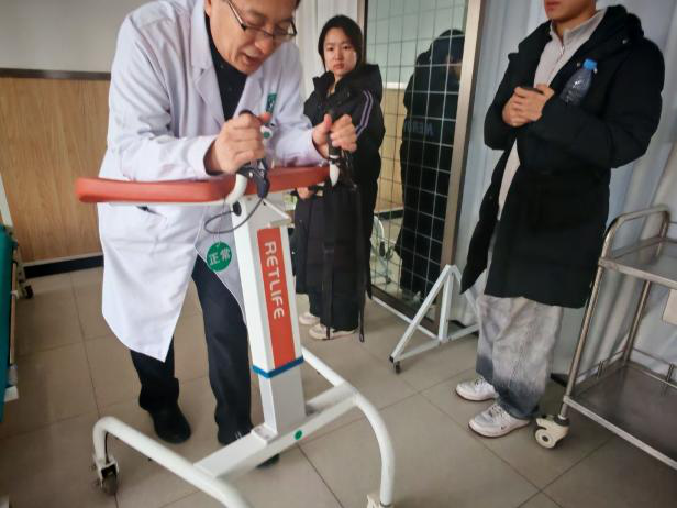 为让实践团更直观地感知康复设备的临床应用现状与技术需求,王主任带领成员实地参观了康复治疗区,逐一介绍各类核心康复设备的治疗机理及临床应用中的问题。他以下肢智能康复机器人为例:该设备通过人机协同与智能控制系统带动患者下肢训练,可实时调节助力,适配脊髓损伤致下肢瘫痪患者;借重复训练激活受损神经通路,实现神经功能重塑。这也让实践团更清晰地看到,电子信息技术与康复医疗的深度结合,正是破解临床康复痛点的关键方向。