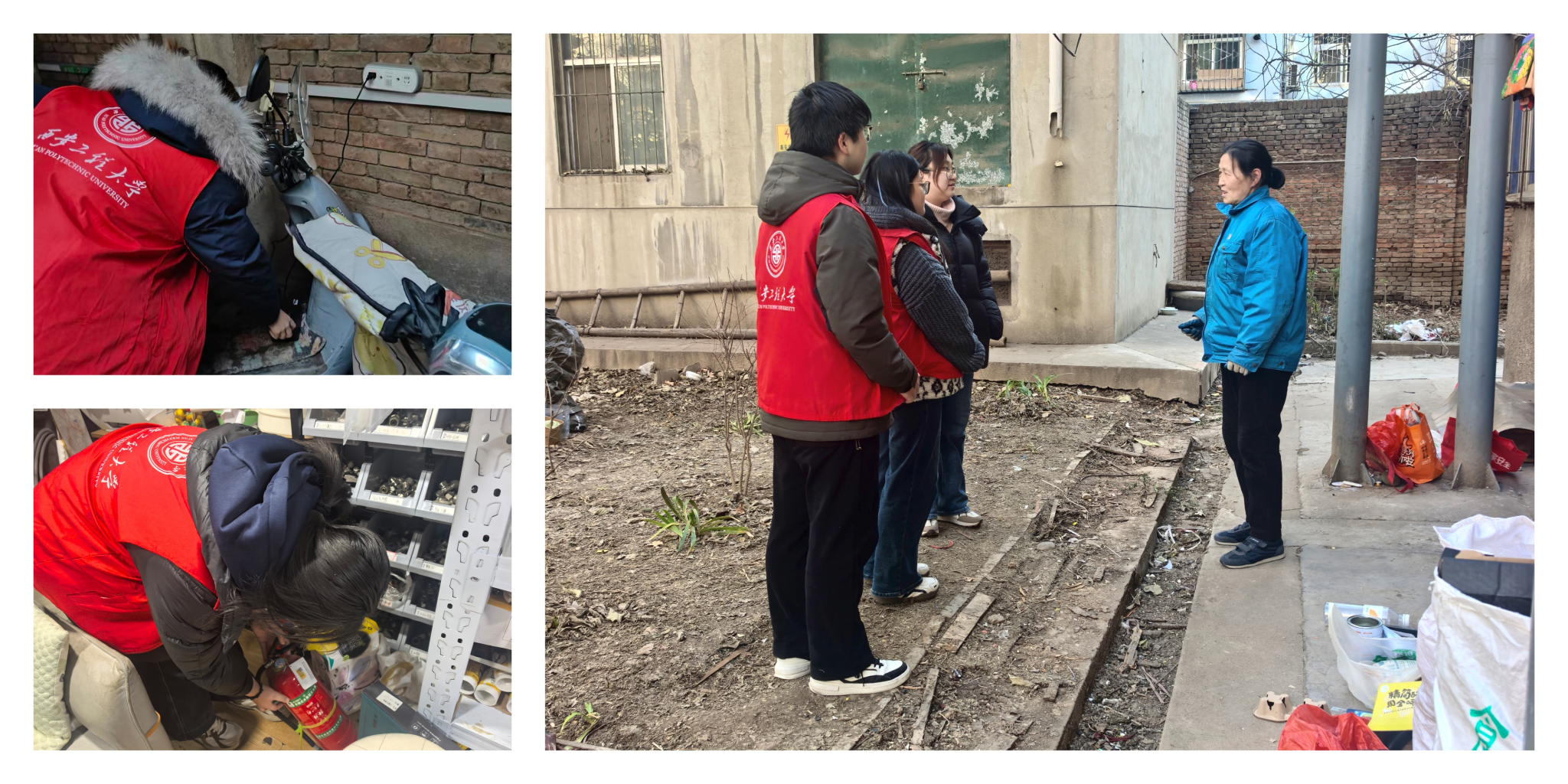 1月9日-13日,实践团队走进西安万年社区,聚焦社区安全与文明建设开展专项排查工作。团队成员兵分多路,一方面对社区内商户的消防器械进行全面检查,仔细查看灭火器、消防栓的有效期、压力值及完好情况,对存在器械过期、摆放不当等问题的商户,现场进行提醒并告知整改要点;另一方面针对老旧小区内电动车违规充电、楼道堆物,以及辖区内垃圾不分类、随意丢弃等不文明现象展开巡查,对发现的问题及时劝导纠正,同时向居民普及消防安全知识和垃圾分类常识,引导大家共同维护安全、整洁的社区环境。此次社区排查,不仅切实排查了社区安全隐患、规范了居民文明行为,更让团队成员在实践中体会到基层服务的意义,提升了发现问题、解决问题的能力。