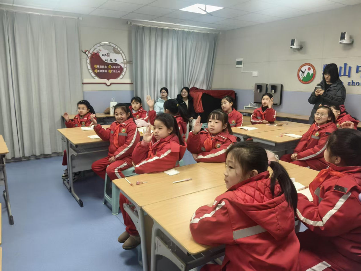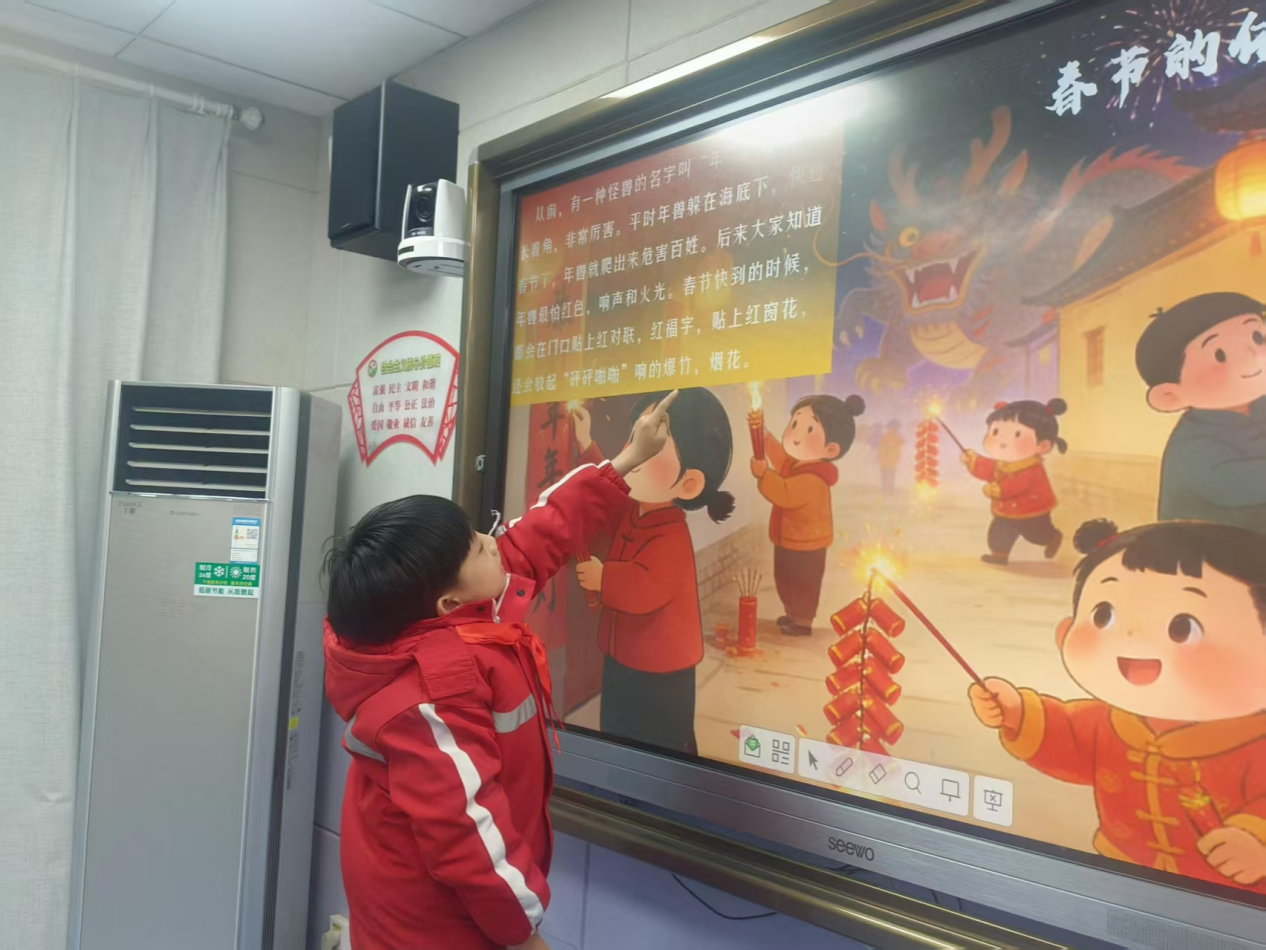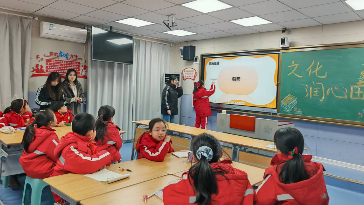 随后,团队成员以“新年的小秘密”为主题开启春节习俗互动问答。“贴春联有什么寓意?”“除夕夜守岁是为了什么?”一个个问题抛出后,教室里立刻变成热闹的“抢答赛场”。孩子们争抢着分享扫尘、吃饺子、逛庙会等习俗,团队成员则结合“年兽传说”等小故事补充讲解,让孩子们在趣味问答中加深了对传统民俗的理解。为了让孩子们直观感受春节符号,成员们还展示了灯笼的图片,用通俗的语言讲解其历史与工艺,孩子们睁着好奇的大眼睛,时不时发出惊叹。