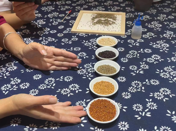 1月21日,实践队拜访吴起县糜粘画非遗传承人,深入了解糜粘画以天然谷物为材料、以民间故事为题材的传统技艺。传承人现场演示糜粘画制作流程,并讲述其与陕北革命文化的深厚渊源。队员们积极参与实践,亲手体验谷物粘贴、色彩调配等环节,在非遗技艺中感受劳动人民艰苦奋斗的创业精神,为后续文创设计注入灵感。