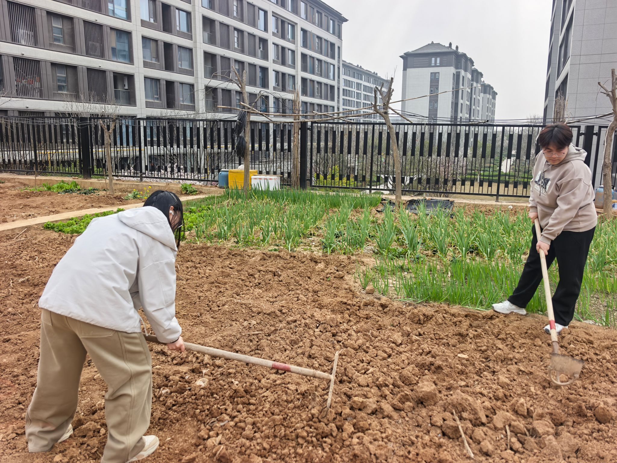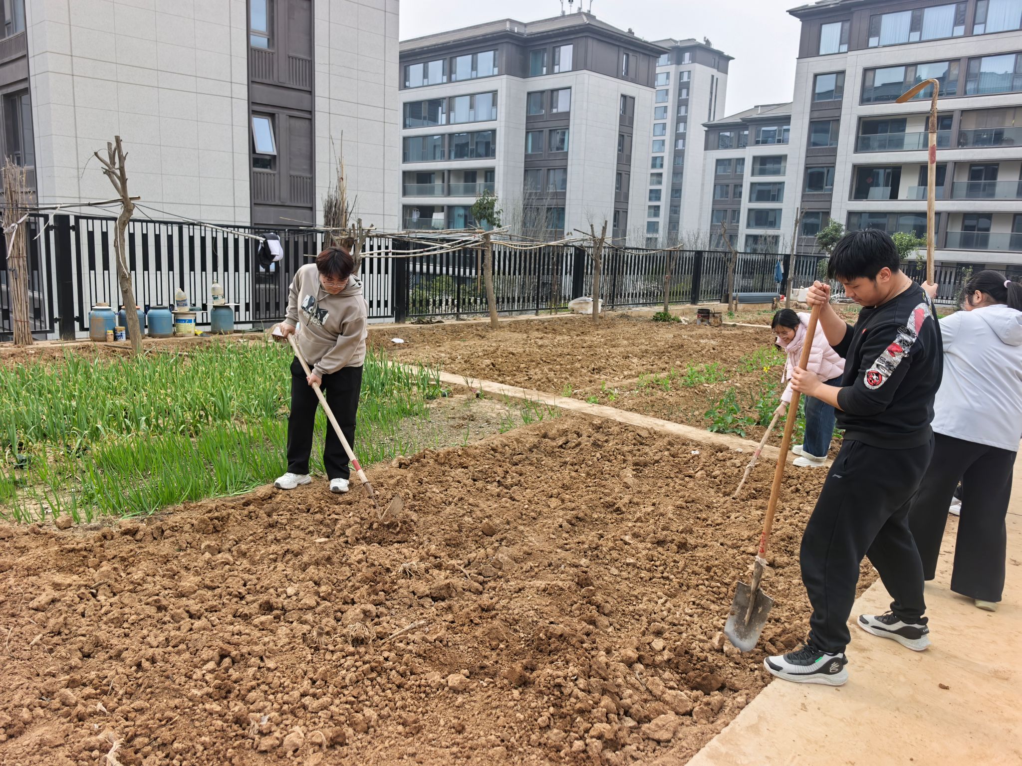 活动现场,大家手持农具,对土地进行二次翻耕,挥锹松土、敲碎土块、清理杂物,细致平整地块,将板结的土壤翻整得疏松细腻。从规范使用农具到精准整地养护,同学们分工协作、默契配合,汗水滴落泥土间,在躬身实践中感受春日生机,体会耕耘之乐。