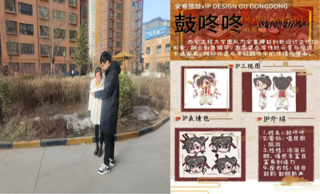 此次延安之行,是实践团“跨省联动+本地深耕”实践模式的重要一环。大家不仅在红色地标中筑牢了理想信念,更深刻理解了非遗传承与红色文化的共生关系。实践中,实践团以“数字化、活态化、多模态”为核心方向,通过问卷调查、访谈等方式,聚焦传承人培养、技艺断层等关键问题,为完善调研报告《“数字化·活态化·多模态”开启安塞腰鼓传承与传播新篇章策略研究》、提出“三位一体”路径积累了扎实的实地素材。为扩大社会影响力,团队还打造了微信公众号“鼓潮新击”,制作双语宣传视频《击壤:叩响美丽中国》、双语宣传手册《鼓动云链·美育共生》,原创IP形象“鼓咚咚”及相关衍生文创产品,以青年喜闻乐见的方式活化传承与传播安塞腰鼓文化。实践团不仅在红色地标中筑牢了理想信念,更深刻理解了非遗传承与红色文化的共生关系。陕北鼓乐——安塞腰鼓,作为延安地区的重要非遗项目,其激昂的韵律中本就蕴含着红色革命的精神底色。未来,实践团将继续深挖延安红色文化与非物质文化遗产安塞腰鼓的融合点,用青春力量让传统鼓乐在新时代焕发新声,让红色精神在安塞腰鼓传承与传播中永续传承。