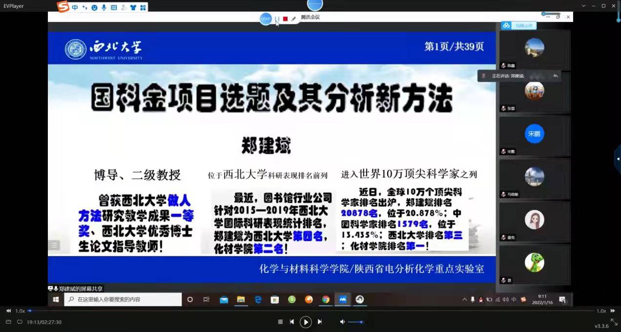 1月16日上午,电子信息学院在线召开2022年度国家自然科学基金专题报告及第一轮评审会。本次会议特邀西北大学郑建斌教授为指导专家,我校科技处处长朱耀麟教授、电子信息学院院长景军锋教授、副院长张蕾副教授、院长助理张凯兵教授及学院拟申报基金的三十余名教师参加本次会议,会议由科技处处长朱耀麟教授主持。