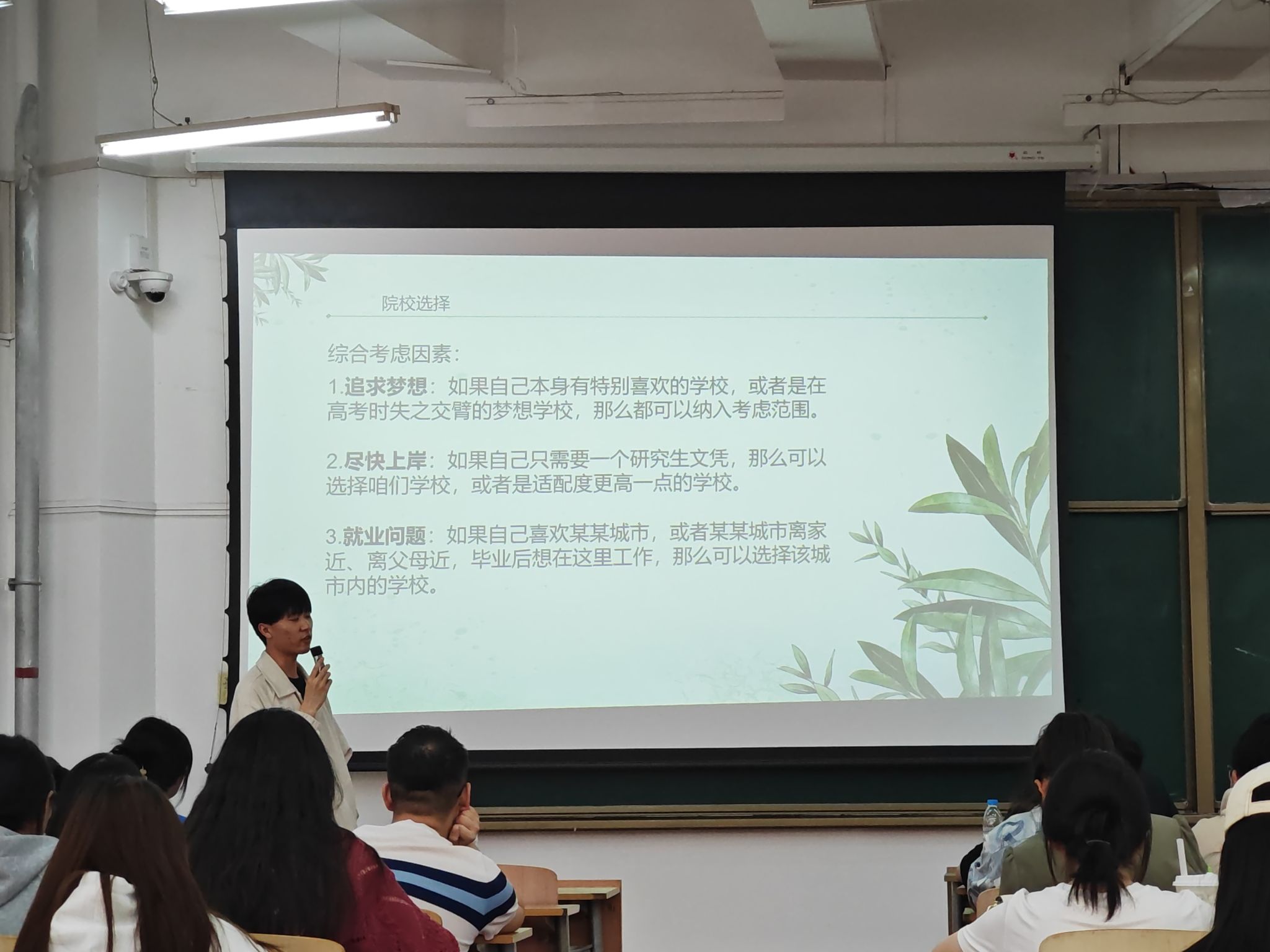 王德利总结了人文学院历年的考研情况,对学院在考研领域取得的优异成绩表示祝贺,指出当前的考研形势依然严峻,竞争依然激烈,也希望有意考研的同学们要根据当前形势,提前做好规划准备,向学长学姐取经学习。