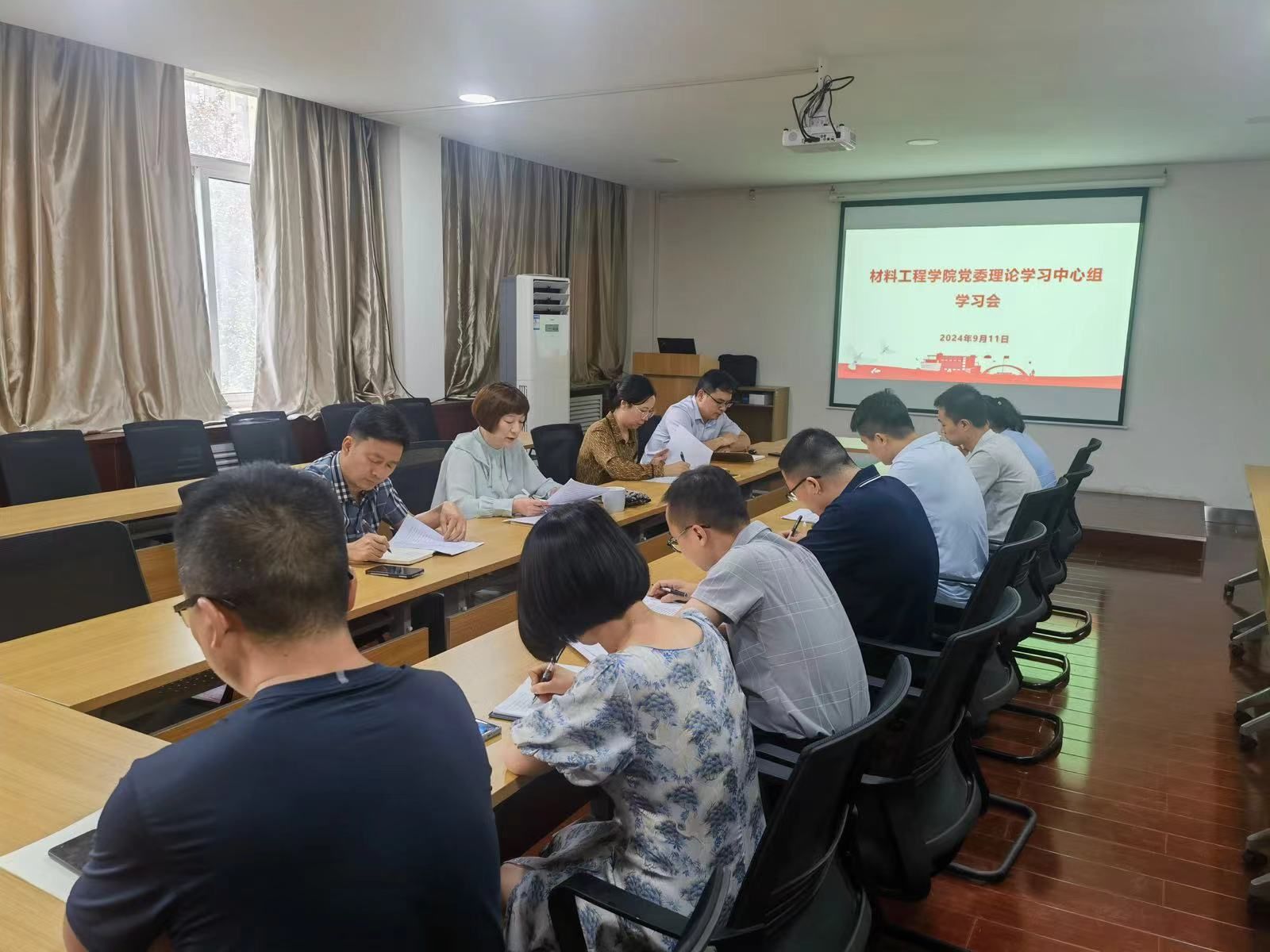 9月11日,材料工程学院党委理论学习中心组在学院 215 会议室召开学习会,专题学习党的二十届三中全会精神。学院党政领导班级成员、党委委员以及各支部书记参加会议。会议由学院党委书记赵雪曼主持。