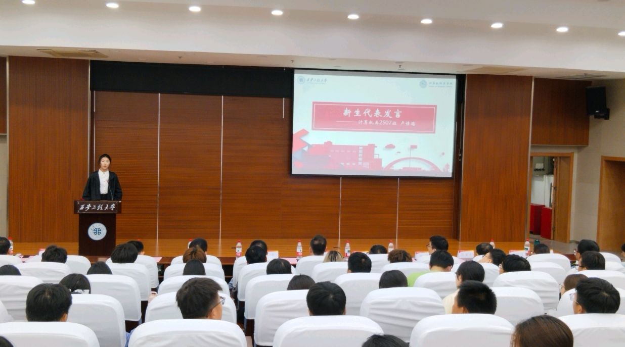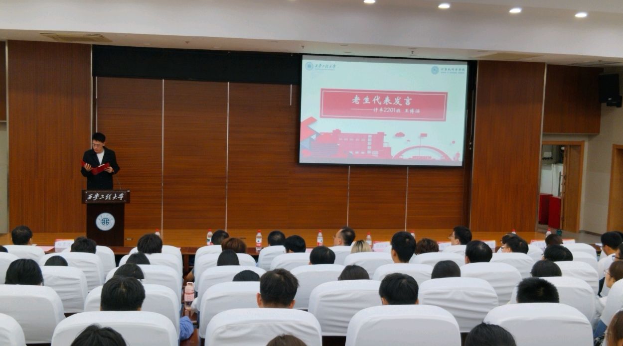 随后,新生代表计算机类2507班卢佳瑶同学发言,表达了对大学生活的美好期待与立志成才的决心,展现出新生积极向上的精神风貌。老生代表计卓2201班王博涵同学结合自身成长经历,分享了学习经验与大学生活感悟,为新生们提供了宝贵的借鉴。