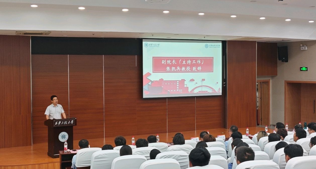 大会伊始,张凯兵教授致辞,他代表学院全体师生,向新加入的莘莘学子致以最热烈的欢迎。随后,他以“筑梦、追梦、圆梦”为核心主题,向新生们提出了三点殷切期望:一是锚定方向,夯实专业根基,广泛涉猎,明确人生目标;二是砥砺前行,面对技术快速更新与挑战,保持坚韧不拔,勇于探索,不怕犯错;三是践行知行合一,勇担时代使命,将个人梦想融入国家发展的洪流中,紧扣时代脉搏,将技术创新转化为推动社会进步的强劲动力,并衷心祝愿同学们能以梦为马,不负青春韶华,学有所成,梦想璀璨照进现实。