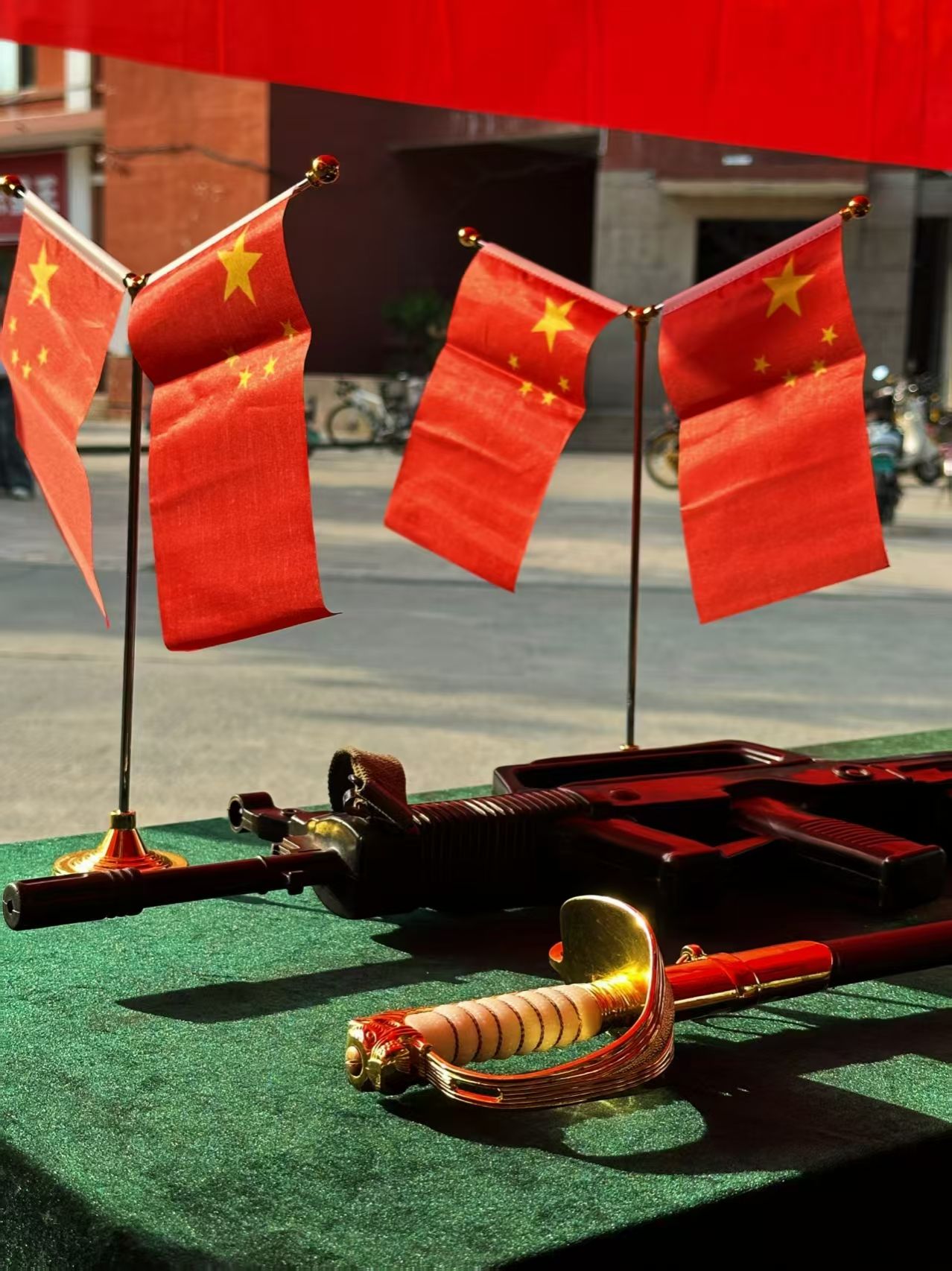 摄影作品(图二)聚焦微型五星红旗与军品模型的组合:几面小巧的国旗在阳光下鲜红夺目,与一旁的军品模型交相辉映,无声诉说着国防力量与家国尊严的紧密联结,于细微处传递对祖国军事力量的崇敬与身为国人的自豪。