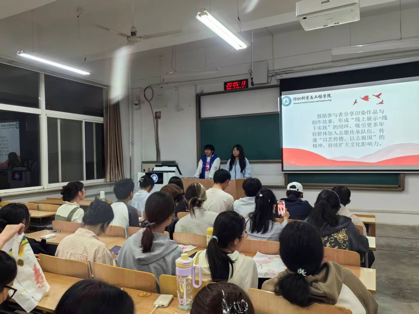 染艺实践,传承纺织文脉。影片观看结束后,学院手工印染社的成员结合实物演示,详细介绍了印染技巧及其注意事项。随后,同学们分组动手操作,用刷子蘸取颜料,在棉布上细细晕染,将对祖国的祝福融入图案设计,在一次次上色中感受颜色交织的韵律。现场欢声笑语不断,大家在亲手创作中体会纺染工艺的精妙。