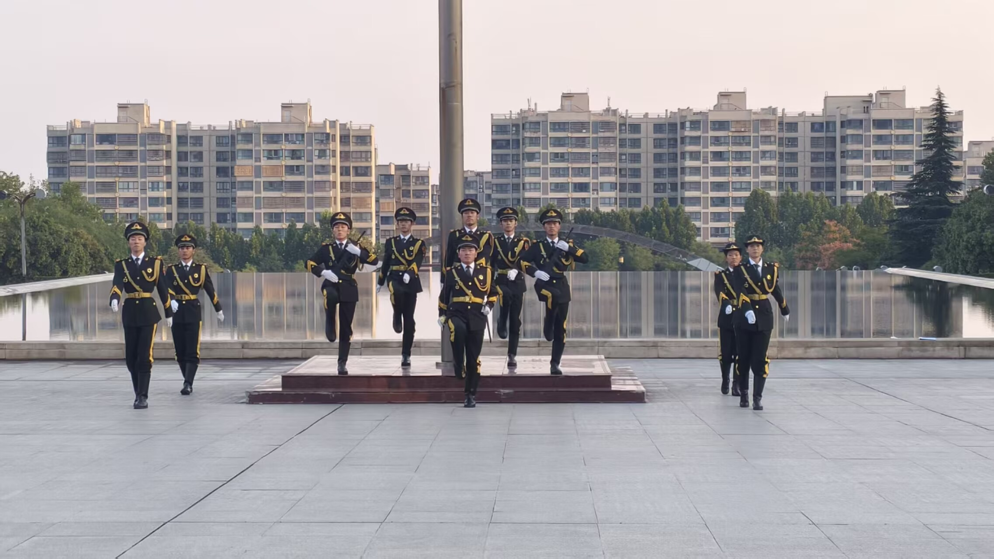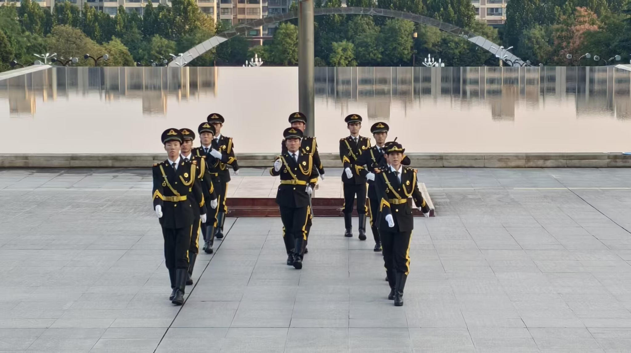金秋拂晓,晨风轻拂。国旗护卫队身着制服,口号响亮,迈着整齐的步伐护送鲜艳的五星红旗入场。《义勇军进行曲》的激昂旋律响起,五星红旗冉冉升起,全体同学肃立致敬,行注目礼。红旗上闪耀的五角星,不仅象征着庄重与荣耀,更凝聚着磅礴厚重的中国力量与矢志昂扬的时代梦想。