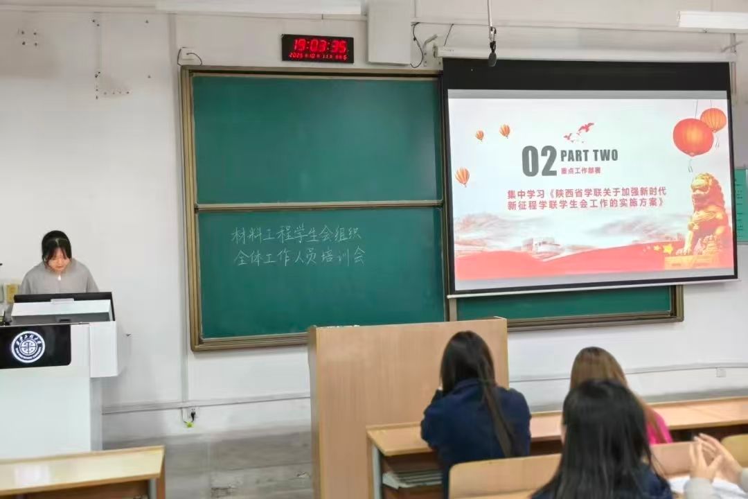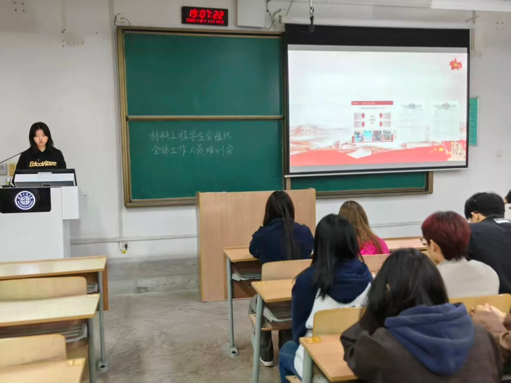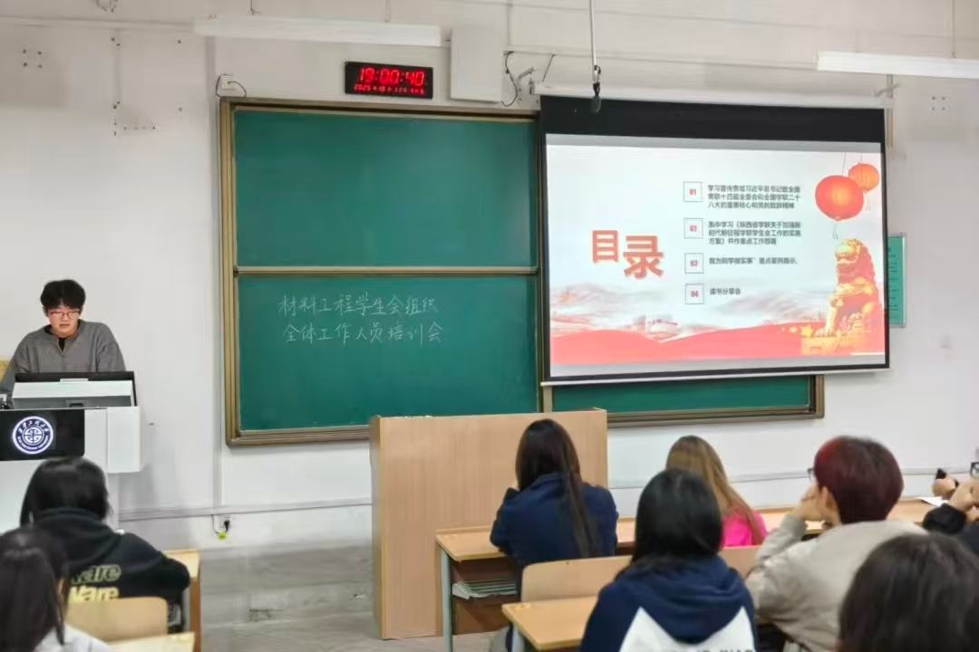 为贯彻落实全国青联十四届全委会、全国学联二十八大的重要核心和党的致辞精神,10月11日,材料工程学院于临潼校区A124教学楼开展学生会工作人员培训大会。本次活动由材料工程学院学生会主席团成员高卓主持,学生会全体成员参加本次会议。