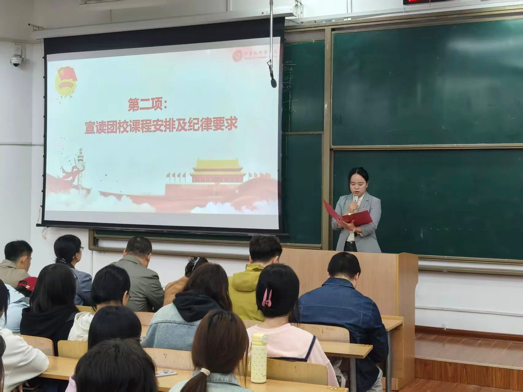 左温慧指出,本次团校以强化思想政治引领为核心,以夯实基层组织为基础,以提升团干部能力为关键,旨在通过系统化、专业化的培训,助力团员青年筑牢理想信念根基、提升理论素养与实践综合能力,持续增强学院团组织的凝聚力、战斗力与创新力,为推动学院共青团工作提质增效筑牢根基。随后,她详细介绍了本期团校的课程体系:课程围绕“思想引领、能力提升、历史溯源与责任担当”四大模块精准设计,特邀学院党委副书记、辅导员、团委书记、兼职组织员等五位经验丰富的教师开展专题授课,内容既涵盖团史理论学习,也包含实践能力指导,形成“理论+实践”双驱动的培训模式。同时,她强调了上课纪律,要求学员严格遵守考勤制度、积极参与课堂互动与小组研讨;明确本次团课结业成绩由结课考试成绩与日常考勤、课堂表现综合评定;鼓励学员结合计算机科学学院的专业特色,以“严谨务实”的工科态度钻研理论知识,以“开拓创新”的科创精神投身实践行动,真正做到“学有所思、学有所获、学有所用”。