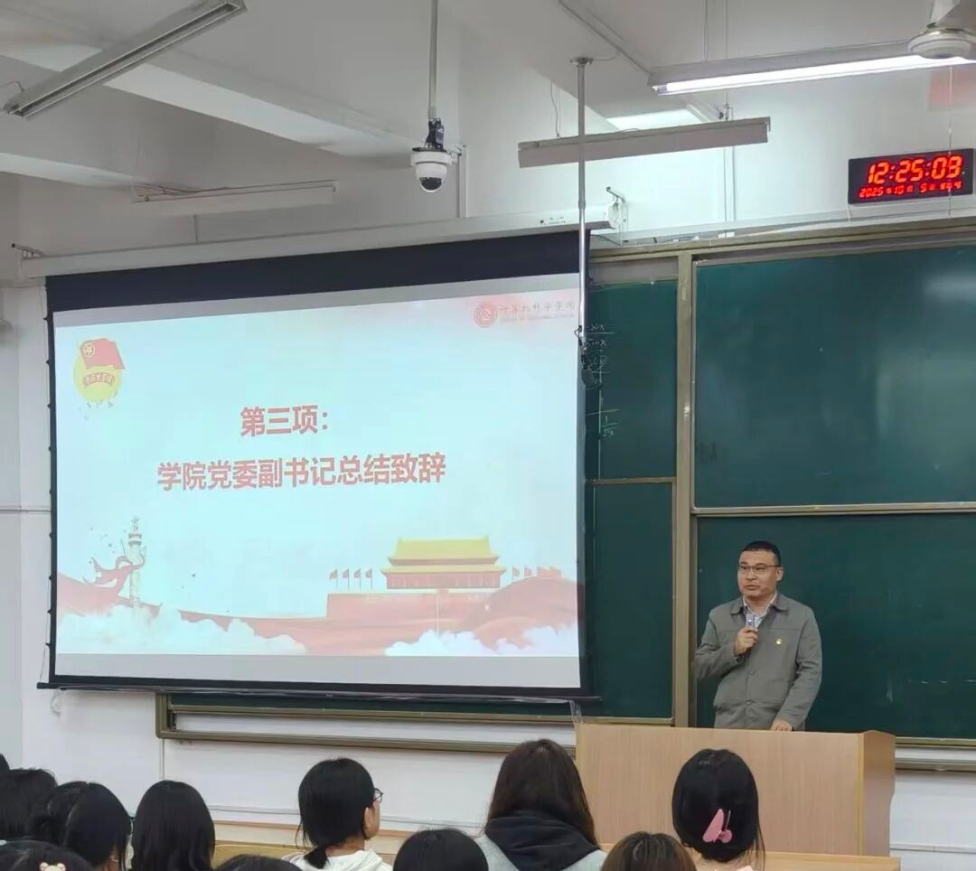 最后,赵勇进为本次团校开班仪式作总结致辞,并围绕新时代团员青年“牢记初心使命,勇担时代重任”为主题开展首场授课。他从“回望初心、立足当下、展望未来”三个维度,与学员深入交流青年成长与时代使命。他深情回顾了中国共青团自1922年成立以来与党同心、跟党同行的光辉历程,通过学院组建“IT智能帮”志愿服务团队、暑期“三下乡”等鲜活案例,生动诠释了“党有号召、团有行动”的优良传统。他勉励全体学员要勇做学风建设的带头人、校园服务的热心人、成长路上的奋斗者,号召要将专业所学与社会需求紧密结合,主动投身乡村振兴、生态环保等社会责任实践,以青春之我创建青春之国家、青春之民族,让青春在全面建设社会主义现代化国家的火热实践中绽放绚丽之花。