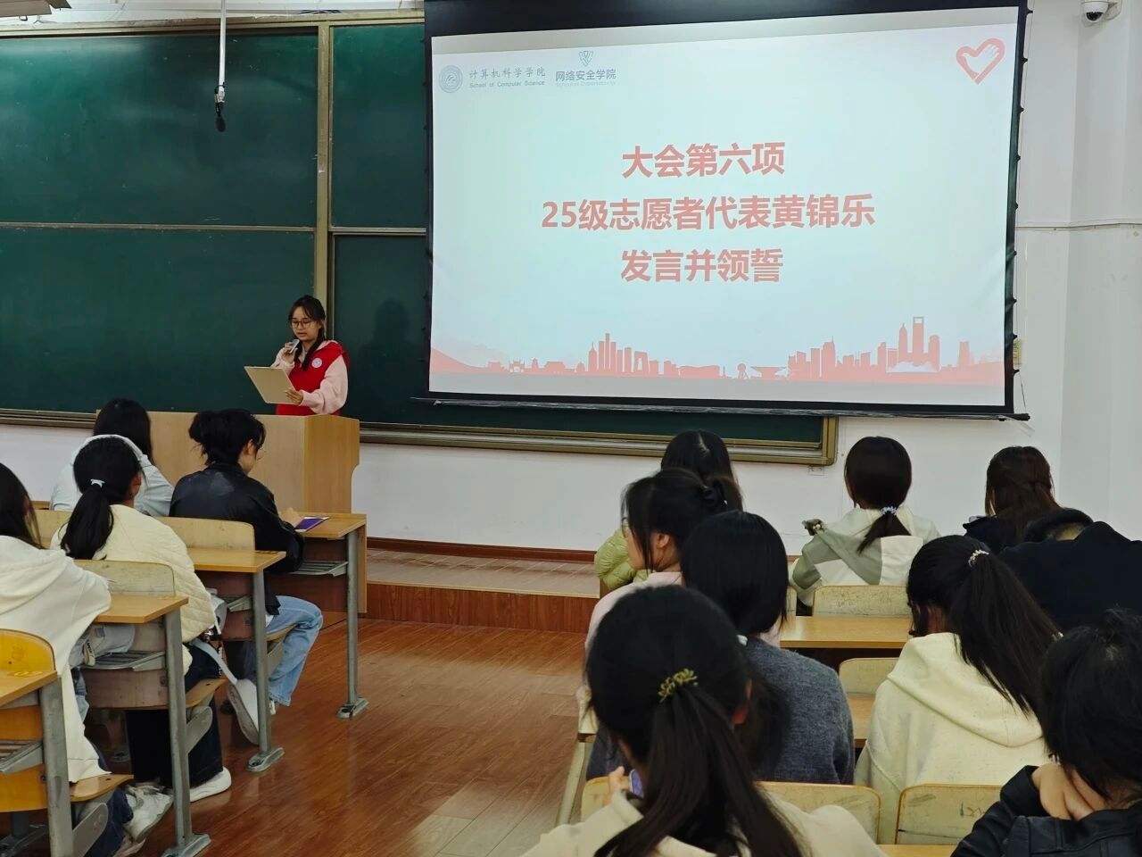 优秀志愿者代表、2023级网络空间安全专业江可瑶分享了自己的志愿服务经历与感悟。她结合校园迎新、敬老服务等具体实践,讲述了志愿服务中“帮助他人、快乐自己”的真切体验,谈到志愿服务不仅让她学会了团结协作、换位思考,更深刻领悟了志愿精神的内涵。她呼吁更多同学加入志愿者队伍,用爱心传递温暖,用行动践行担当。最后,新入会志愿者代表、2025级计算机类专业黄锦乐代表全体2025级青年志愿者表达了对志愿服务事业的热爱与向往,并带领全体新入会志愿者庄严宣誓:“我志愿成为一名光荣的志愿者……”铿锵有力的誓言回荡在会场,彰显了新一代志愿者的坚定信念与责任担当。