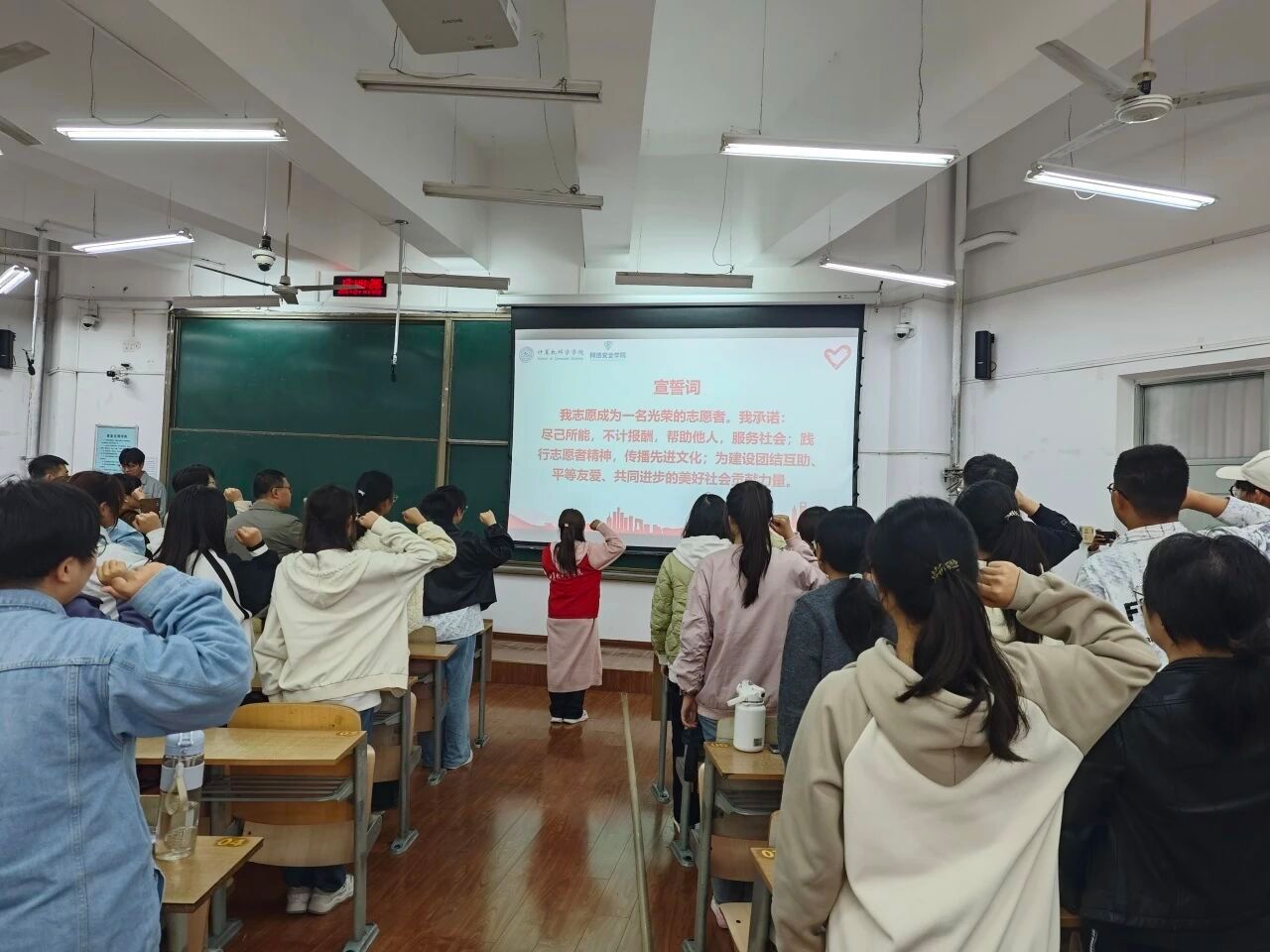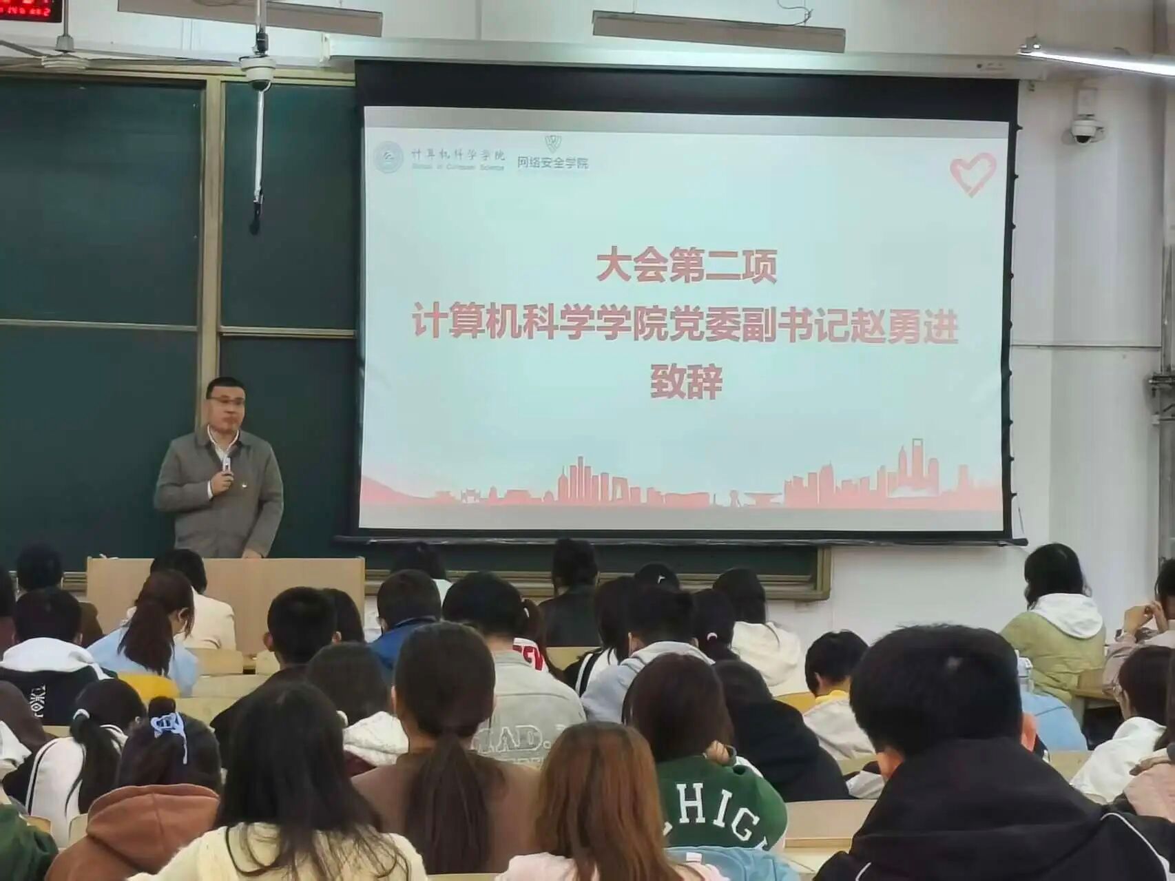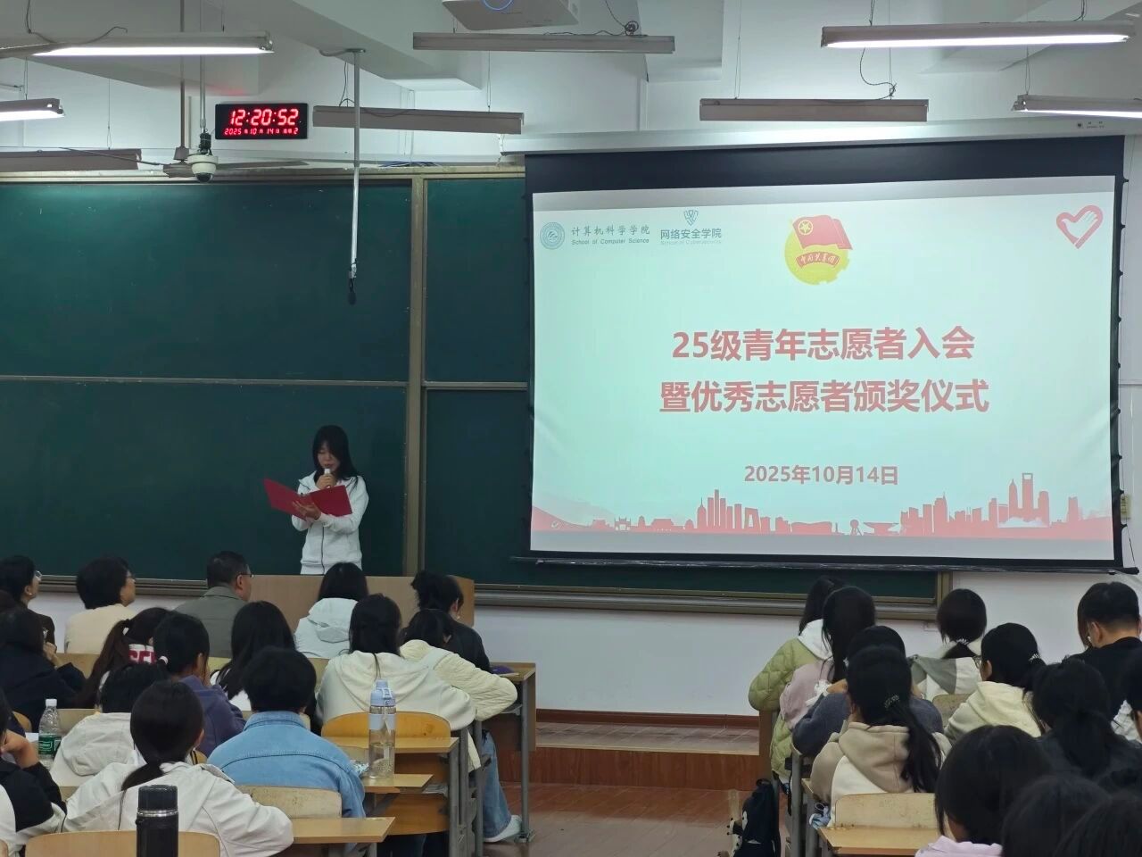 为深入弘扬“奉献、友爱、互助、进步”的志愿服务精神,表彰先进典型,凝聚志愿力量,激励广大青年学生积极投身志愿服务事业,10月14日中午,计算机科学学院与网络安全学院联合举办了优秀志愿者表彰暨2025级青年志愿者入会仪式。计算机科学学院党委副书记赵勇进、网络安全学院党总支副书记刘蓉,两学院全体辅导员及260余名志愿者代表参加活动。