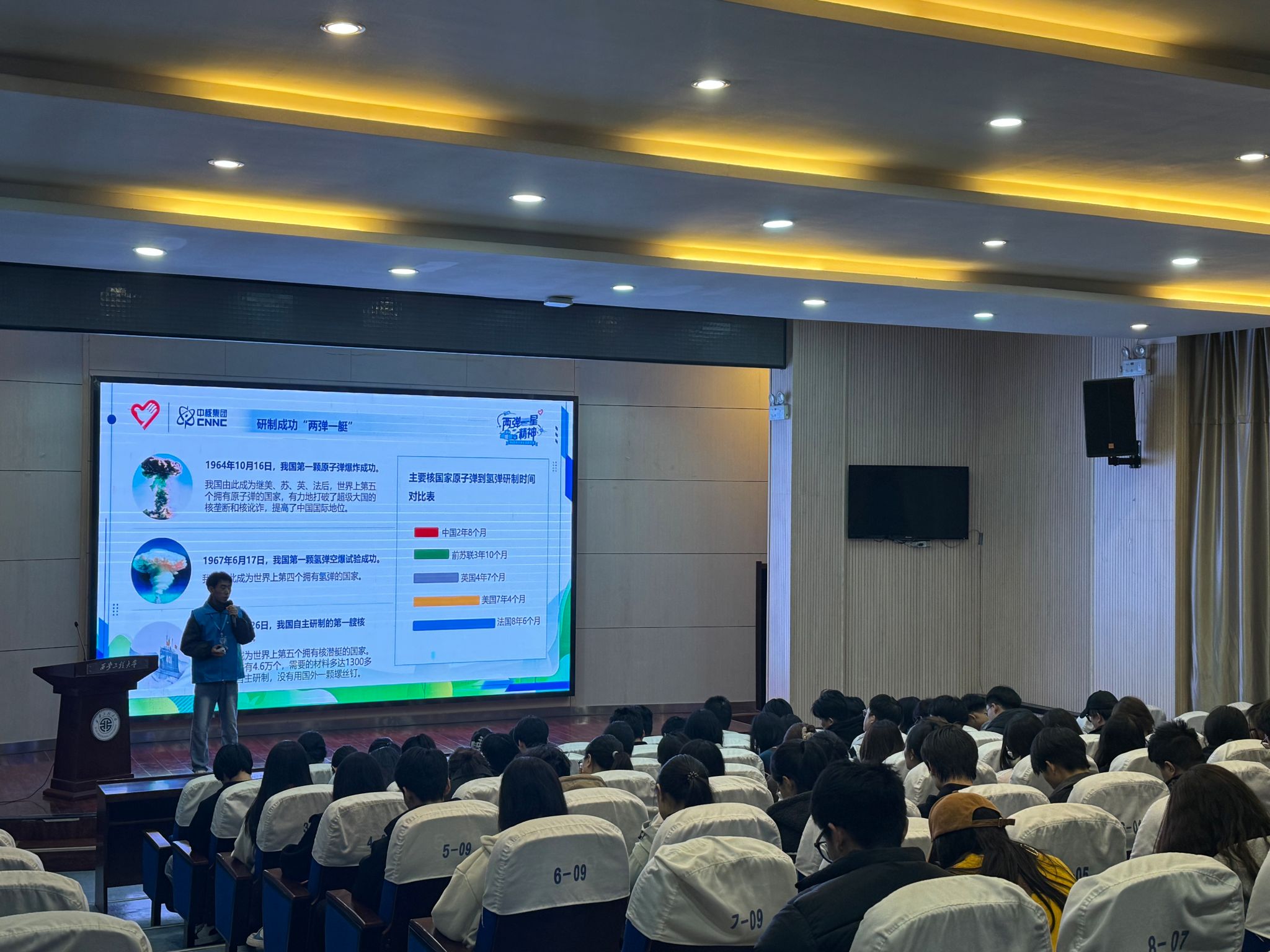 整场宣讲通过详细讲述史料与感人的故事,深刻解读“两弹一星”精神及其衍生出的核工业精神,让同学们深切感受到,中国核工业的每一个里程碑,都是在党的坚强领导下,一代代核工业人热爱祖国、无私奉献、自力更生、大力协同的奋斗下形成的。