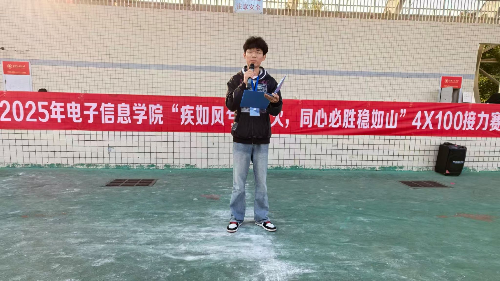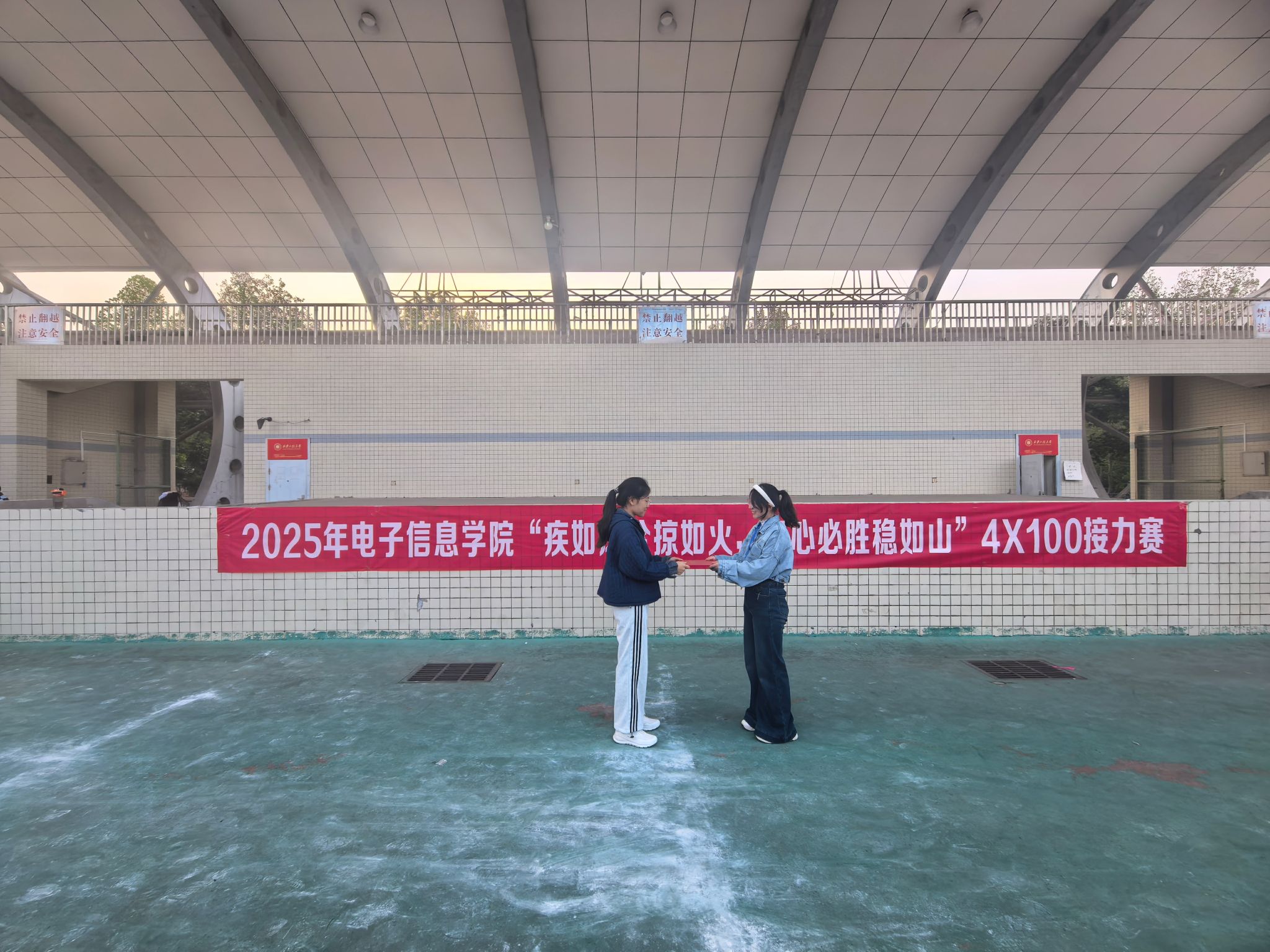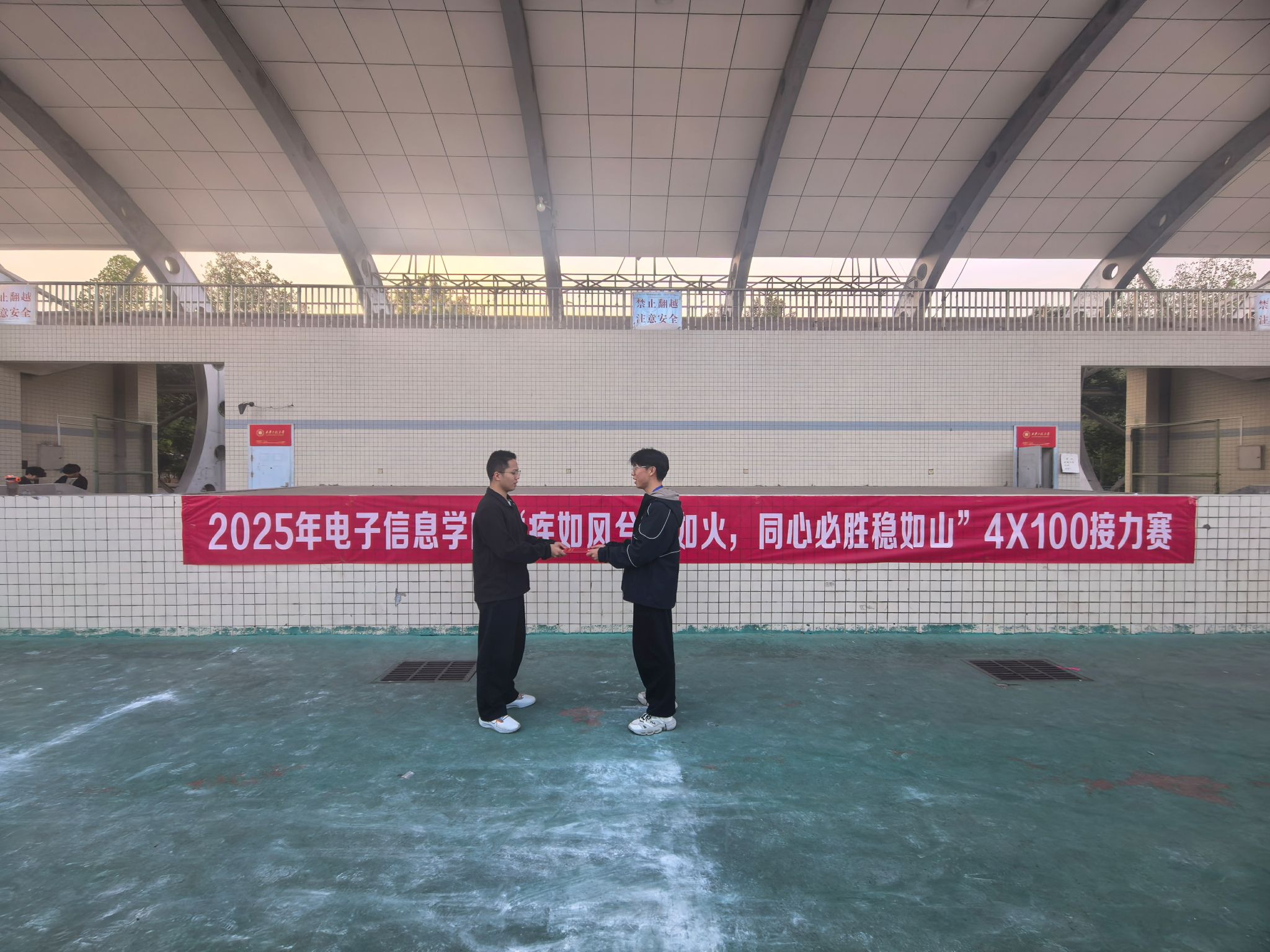 为响应走出宿舍、走向操场、走进阳光的号召,鼓励学生摆脱宅宿状态,主动参与体育锻炼,展现当代大学生青春风貌。电子信息学院于2025年10月26日下午16点到18点,在临潼校区东环体育场开展主题为“疾如风兮掠如火,同心必胜稳如山”的2025级新生4×100米接力赛。开幕式上,学生代表以“团结与拼搏”为核心发表讲话,希望大家在比赛中互帮互助,用汗水书写青春记忆。主持人核对参赛队伍信息,确认无误后宣布比赛开始,各小组依次进入赛道准备。
