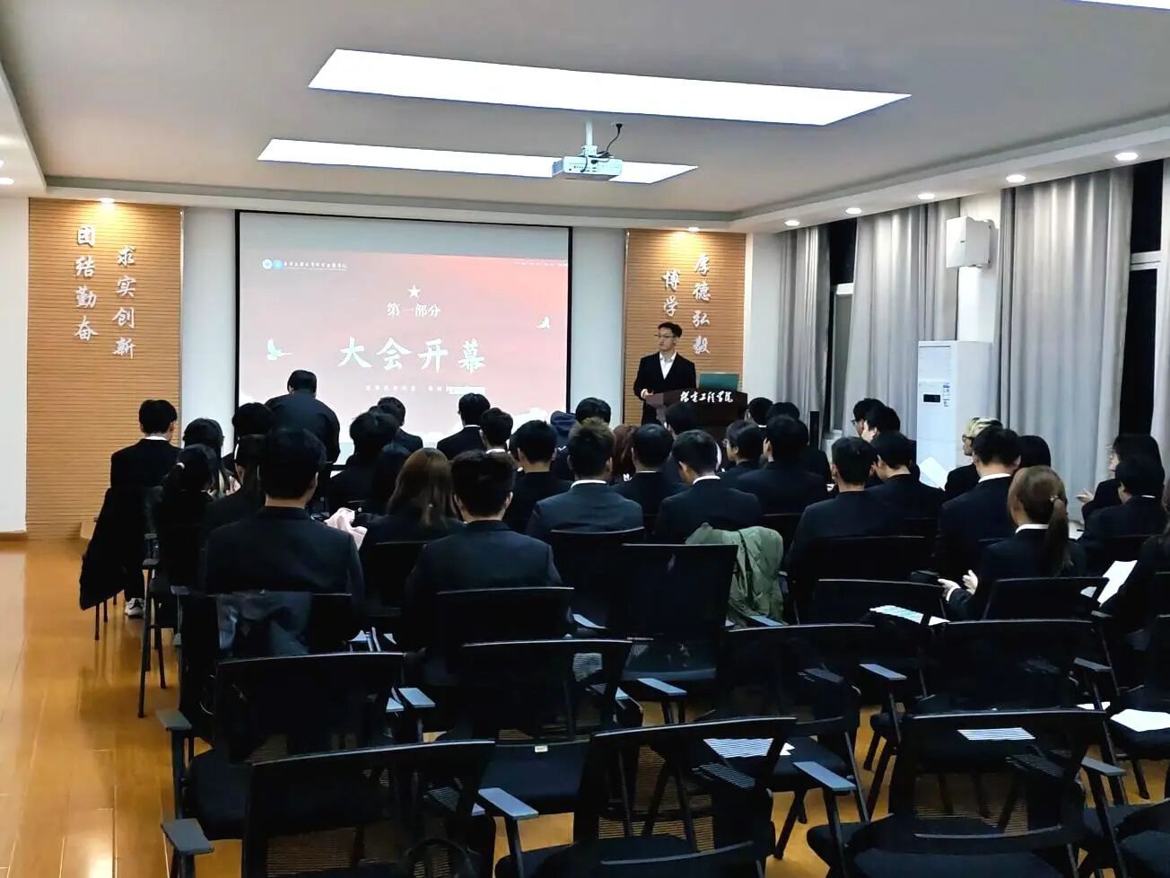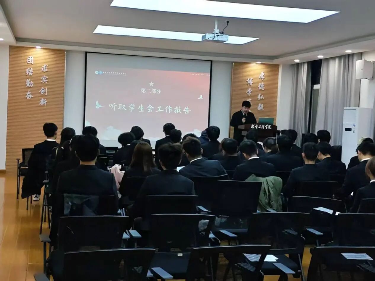 19:30,正式会议在庄严的国歌声中拉开帷幕。上一届学生会主席团成员汪华利首先作工作报告,系统回顾了学生会在思想引领、改革创新、品牌打造等方面的工作成效——以重要纪念日为契机开展思想教育活动,搭建权益维护平台,打造“闪电杯”辩论赛等文体品牌。报告也明确了未来以“有理想、敢担当、能吃苦、肯奋斗”为标准,建设同学信赖组织的发展方向。
