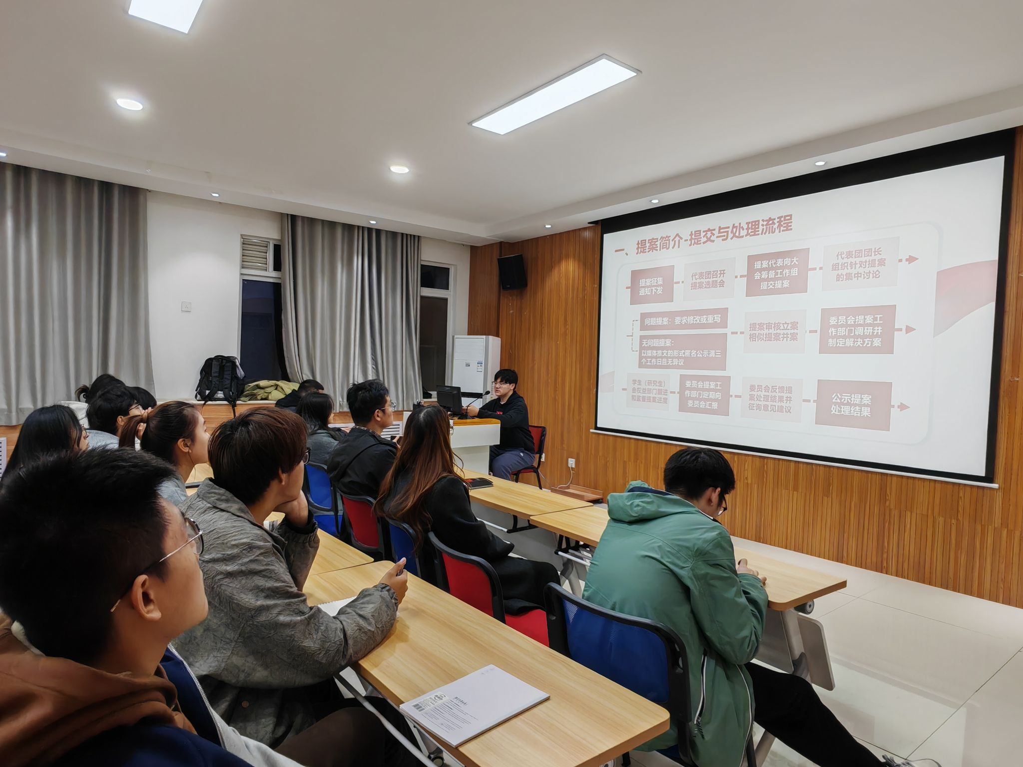会上,朱昱霖首先向大家传达了西安工程大学关于提案工作的相关文件要求,着重强调了提案工作在搭建学校与学生沟通桥梁、助力校园治理现代化中的重要意义。他提到,各位学生代表既要牢记责任,充分行使提案权利,把同学们的真实诉求准确传递出去,也要认真履行提案义务,确保提出的提案内容真实可信、切实可行且针对性强。针对提案撰写的规范与实效问题,朱昱霖还从选题方向、内容框架、撰写要求、提交流程等方面展开了专项指导,结合往年的优秀提案案例,详细拆解了“问题背景、现状分析、原因探究、解决方案、预期成效” 这五大核心模块,避免出现内容空泛、针对性不足等问题,为后续高质量完成提案撰写打下了坚实基础。