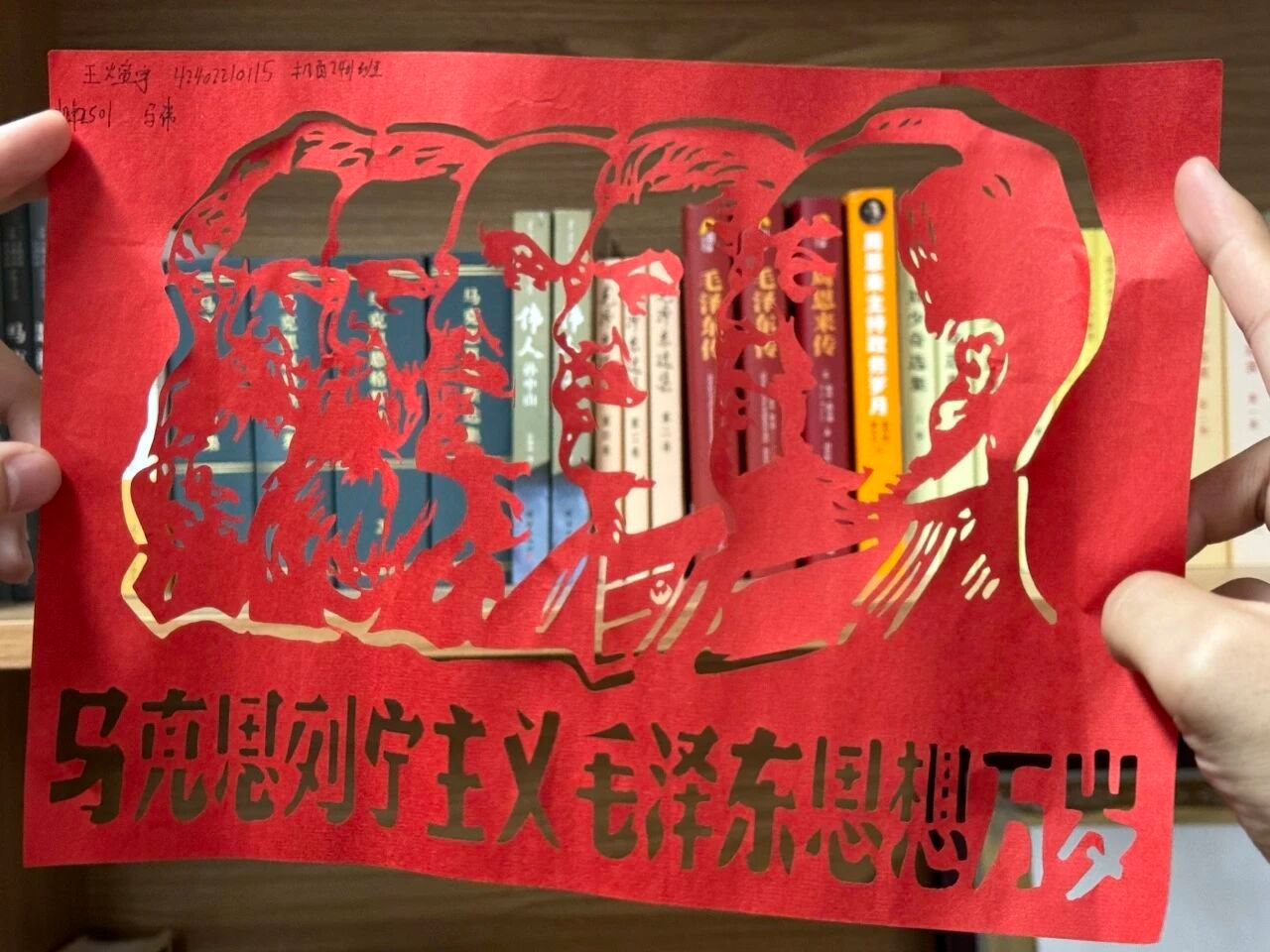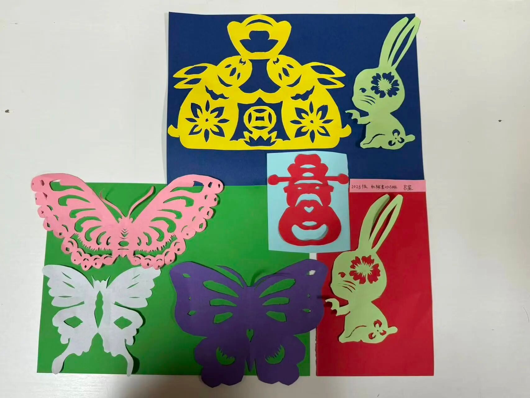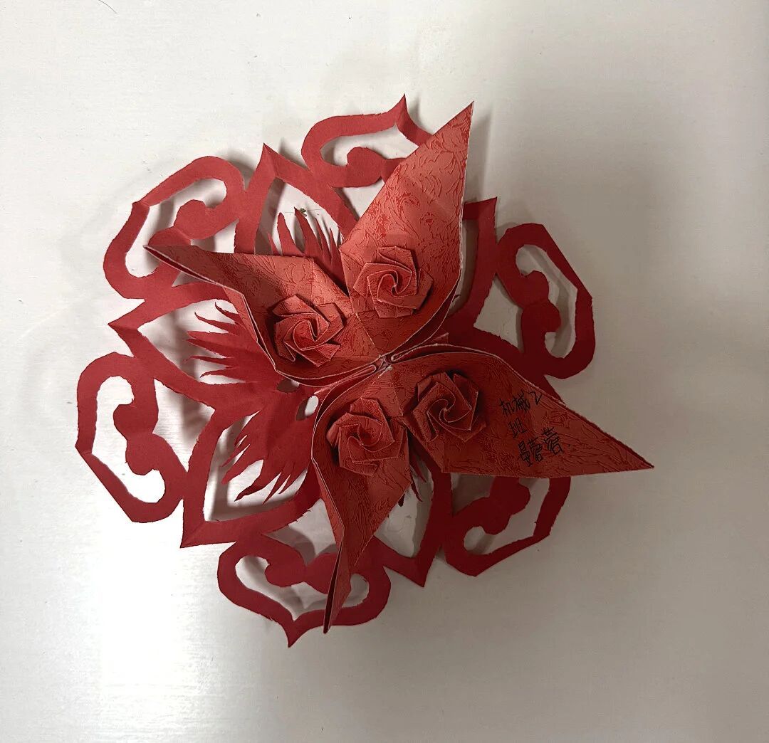 红色纸艺蝴蝶,是一件融合了折纸与剪纸技艺的红色纸艺作品,主体是一只造型精致的蝴蝶。创作者以带有暗纹的红纸为材料,在蝴蝶翅膀上折叠出立体的玫瑰纹样,增添了层次与质感;蝴蝶外围搭配了镂空的卷草纹剪纸装饰,曲线灵动柔美,既呼应了蝴蝶的灵动气质,又让作品带有传统装饰艺术的韵味。整体以热烈的红色为主调,视觉效果鲜明且富有艺术巧思。