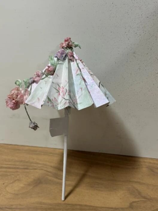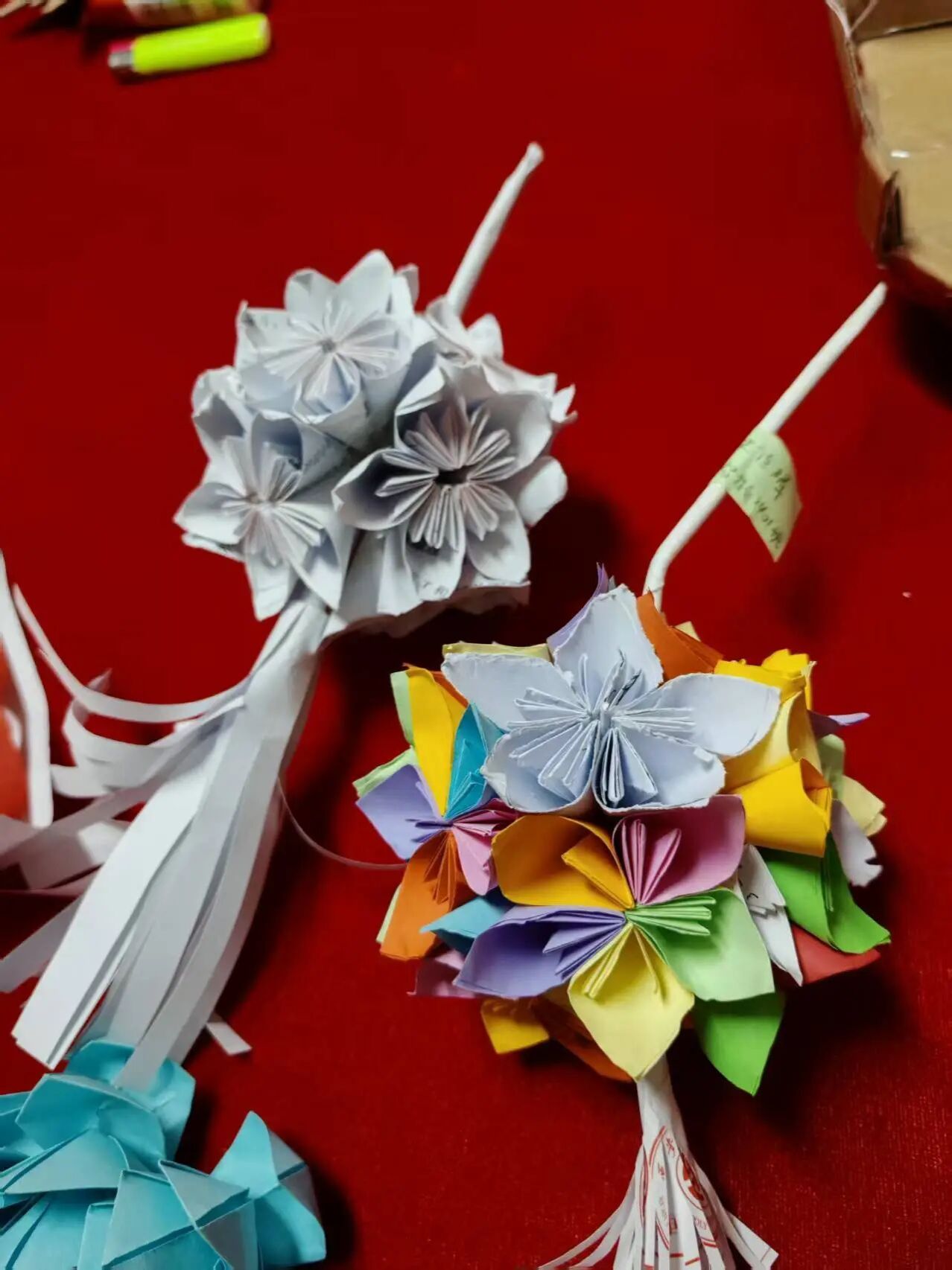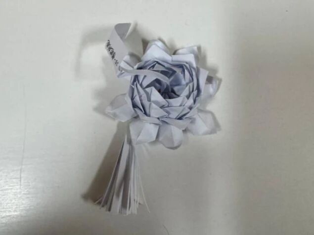 折纸花束,是一组以纸张为材料的折纸花束作品,展现了精巧的手工折纸技艺。花束由多朵立体纸花组成,其中一束以白色纸张折叠,搭配飘逸的纸流苏,风格简约雅致;另一束则选用彩纸,将蓝、黄、紫、绿等色彩的纸花错落组合,色彩明快活泼,花朵的花瓣褶皱细腻,造型饱满逼真。作品以细杆作花茎,细节处还附有标签,既体现了创作者的耐心与巧思,也让折纸花呈现出如同真花束般的生动与温馨。