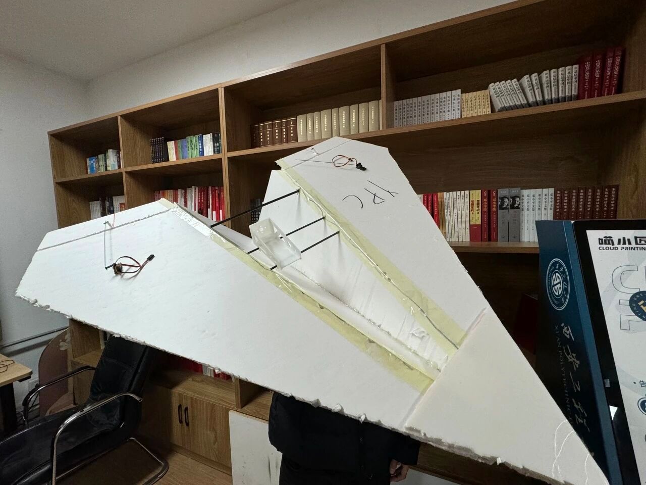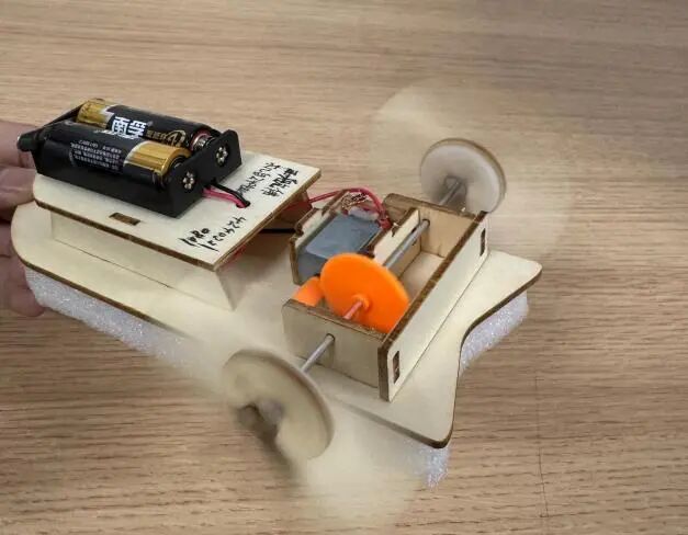 这是一款木质拼装的动力小船模型,主体由轻木板材搭建,搭配电机、齿轮组与电池供电系统。通过电机驱动齿轮传动,可带动螺旋桨旋转。作品结构清晰,将简单的机械传动与手工拼装结合,既体现了动手实践的乐趣,也融入了基础的物理动力知识,是兼具趣味性与科普性的手工创客作品,手写标注更添制作的专属感。