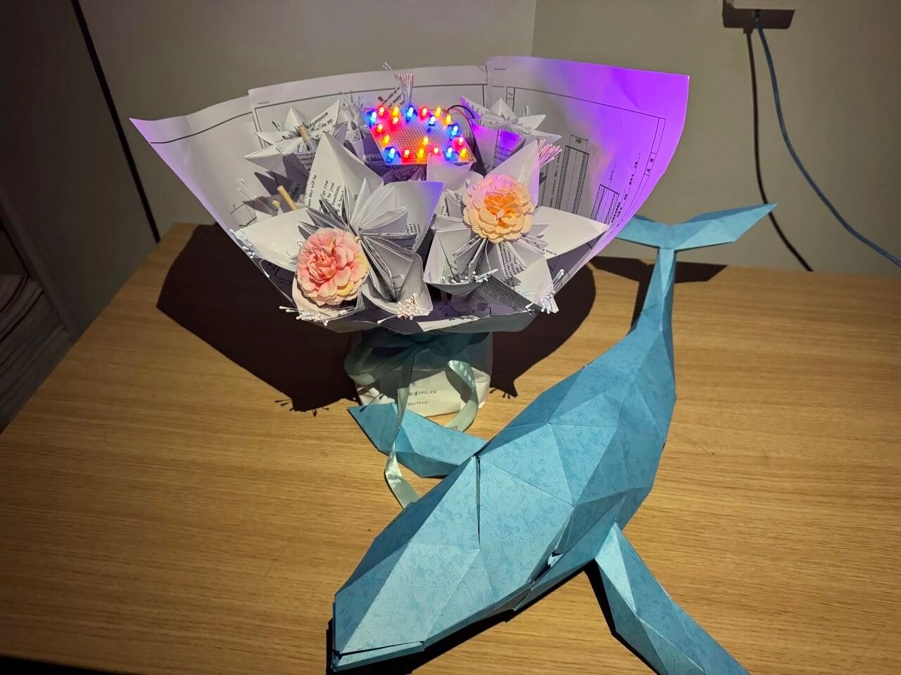 其中蓝色折纸鲸鱼,是一件以低多边形风格呈现的手工作品,以明亮的蓝纹纸张为原料,通过精准的折叠与拼接,将平面纸张塑造成立体的鲸鱼形态。作品线条利落,几何切面组合出流畅的身体曲线,从尖长的吻部到分叉的尾鳍,细节还原了鲸鱼的基本结构,既展现了折纸艺术的空间构造力,也凭借清新的色调传递出海洋生物的灵动质感,是创意纸艺与动物造型结合的趣味作品。