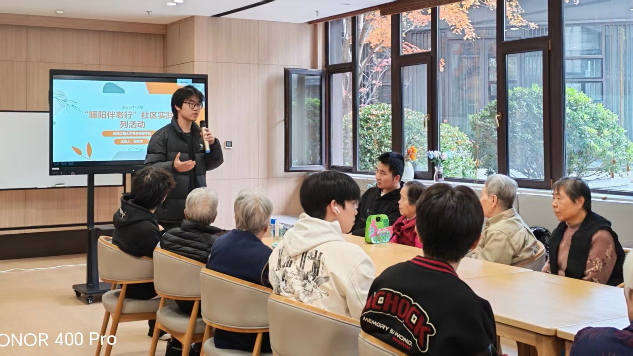 为弘扬尊老爱老的中华优秀传统美德,电子信息学院“暖阳伴老行”实践队联合2024级通信工程1、2班与机器人工程2班于11月8日走进“骊山下的院子”康养中心,与老人们共同开展了一场集歌声、欢笑与温情于一体的“以心相伴,共暖耆年”主题社区实践活动。实践队员们以蓬勃的青春活力,为老人们的晚年生活注入了别样光彩与温暖力量。