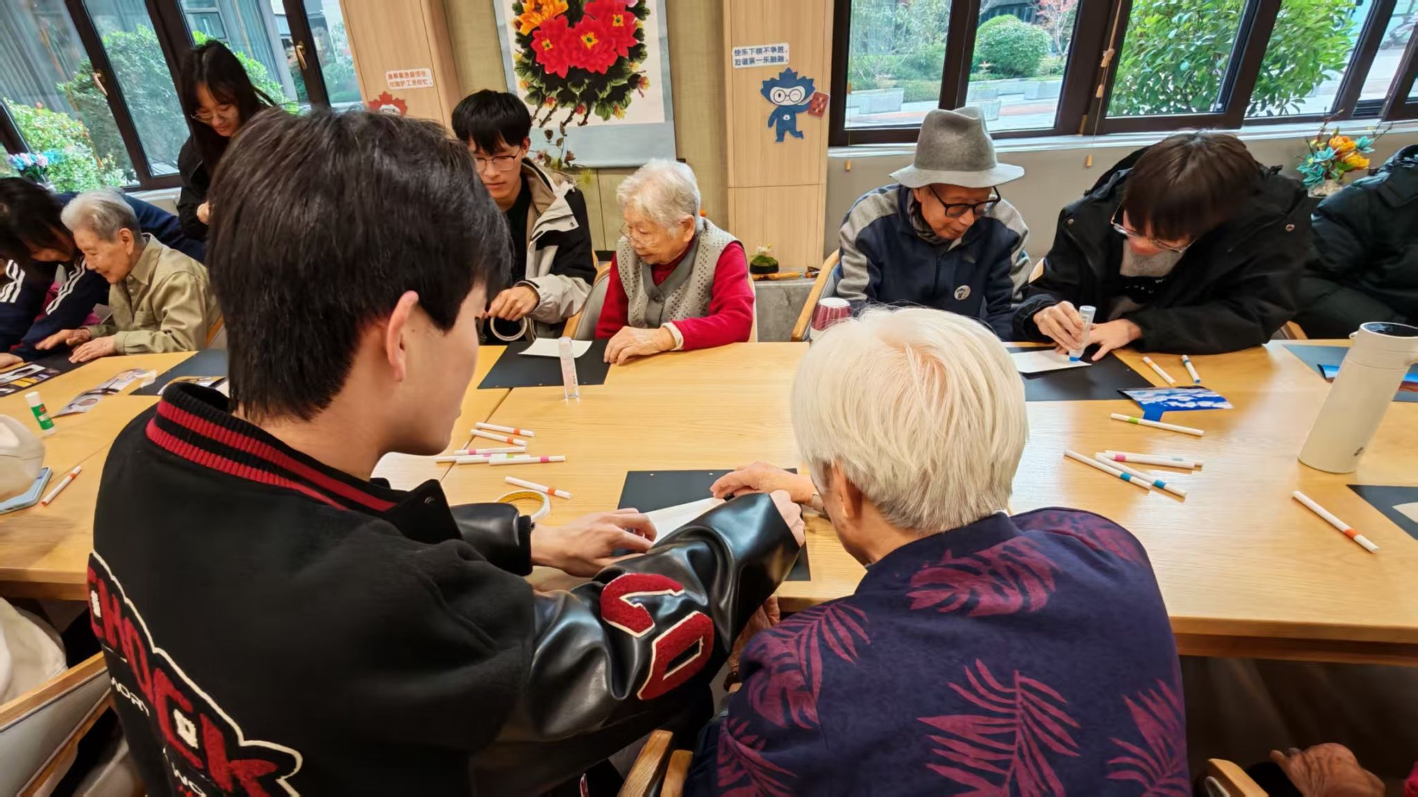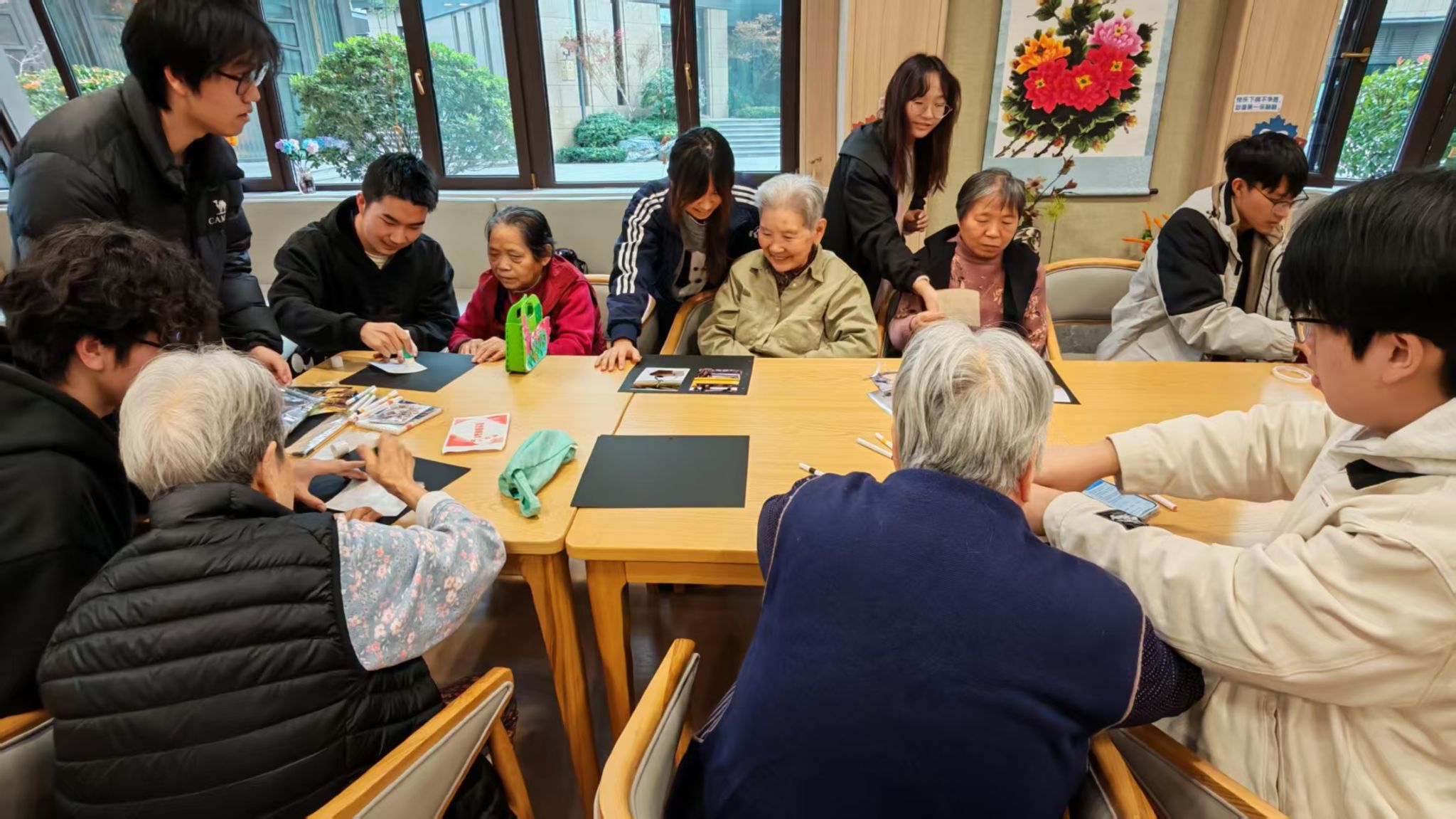 歌声是跨越年龄的温情纽带,更是连接岁月与青春的桥梁。同学们上台演唱红歌,熟悉的旋律缓缓流淌,既勾起了彼此心中共同的回忆,也让脉脉温情在歌声中传递。手工制作环节暖意浓浓,同学们耐心细致地帮助老人们裁剪、粘贴,携手制作精美相册。大家一边动手操作,一边共同翻看旧照片,听老人们讲述照片背后的岁月故事,指尖的温度与岁月的回忆相互交织,将此刻的美好定格成值得珍藏的温暖瞬间。