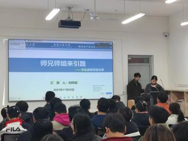 11月20日,城市规划与市政工程学院于学院楼322报告厅举办师兄师姐来引路之“青春征程,筑梦研途”学术经验分享主题活动。本次活动邀请了2024届优秀毕业生刘帅磊、2025届优秀毕业生许燚,为2025级新生做学术经验分享。两位校友结合自身科研学习经历,聚焦研究生学业规划、职业路径选择、研究生学科竞赛与论文写作经验分享等方面介绍了个人读研期间的经验与收获。学院党委副书记鱼园、辅导员赵昊和学院60余名2025级新生参加了此次活动。