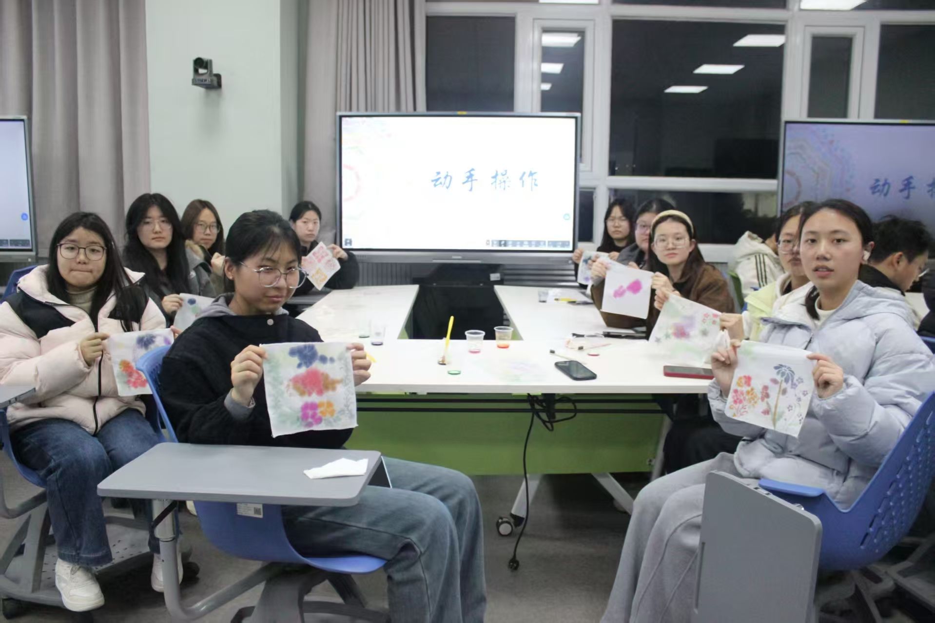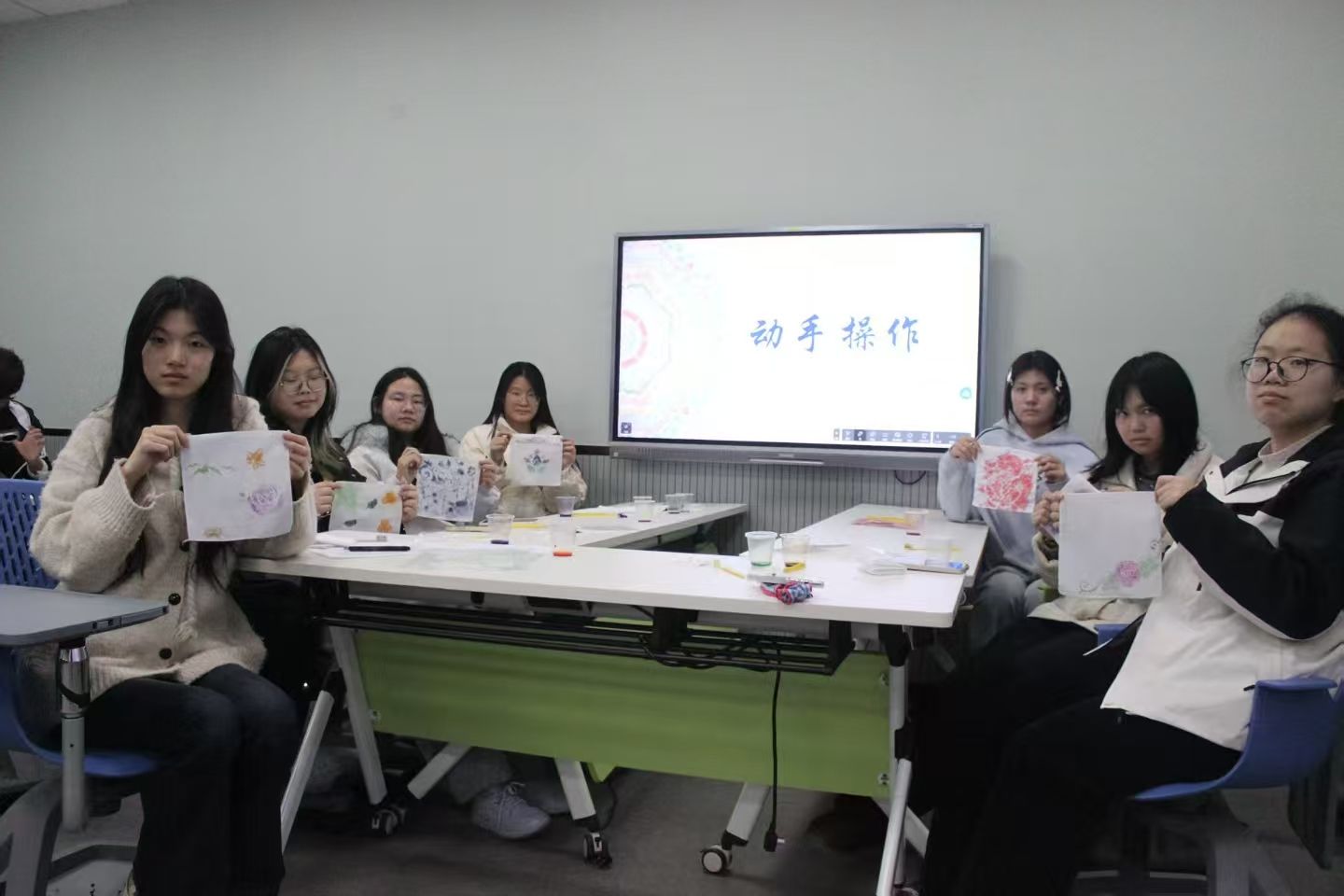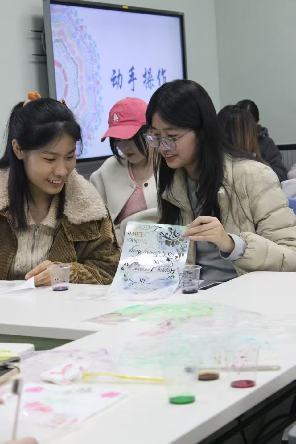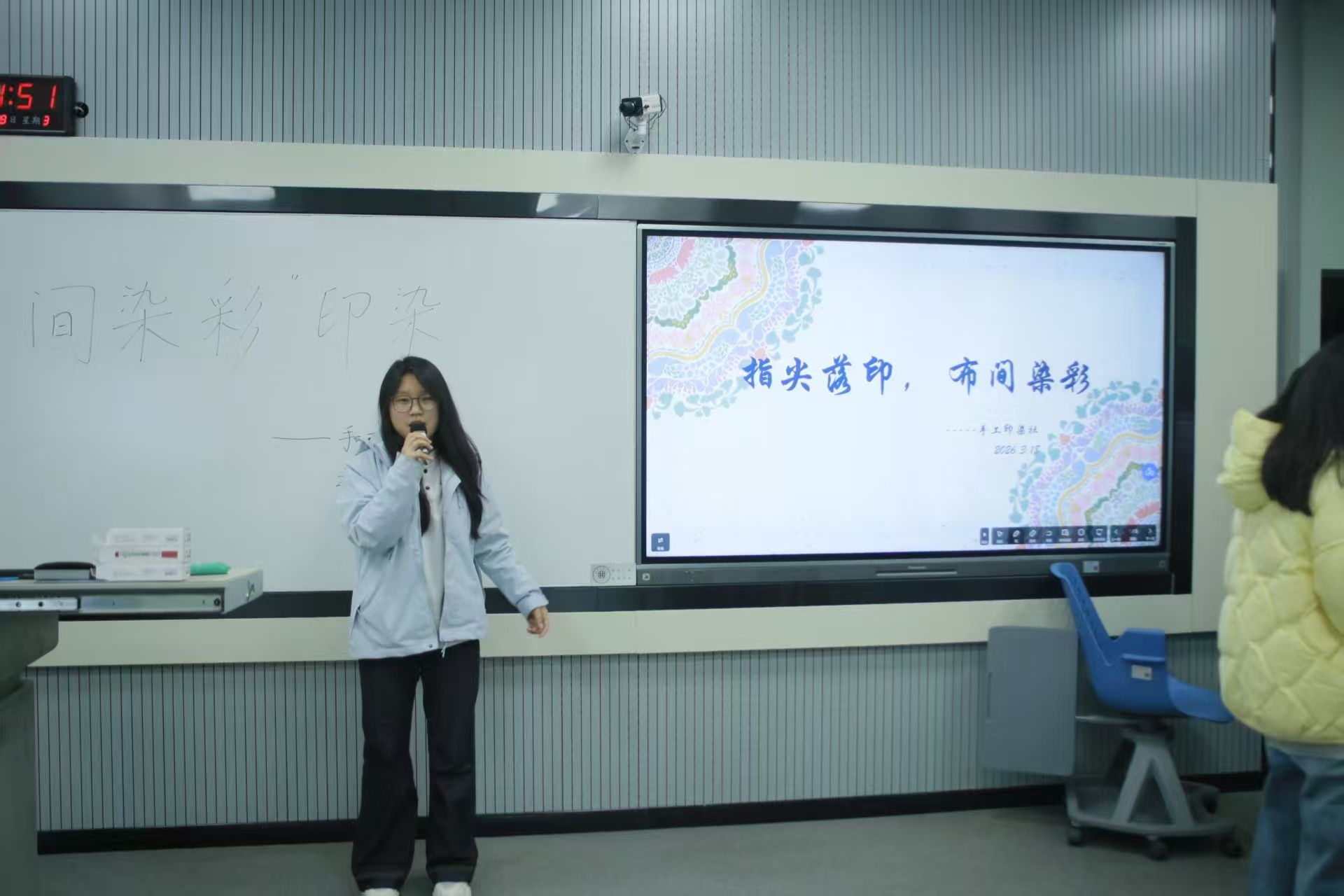 活动伊始,手工印染社社长为同学们详细介绍了传统印染技艺的历史渊源与文化内涵,讲解了以布为底、以印为形、以染为韵的核心工艺特点。社长结合精美印染作品,现场演示了选料、制版、上色、拓印、晕染等完整创作流程,通过直观展示与细致讲解,让同学们对非遗印染技艺有了全面且深刻的认识。