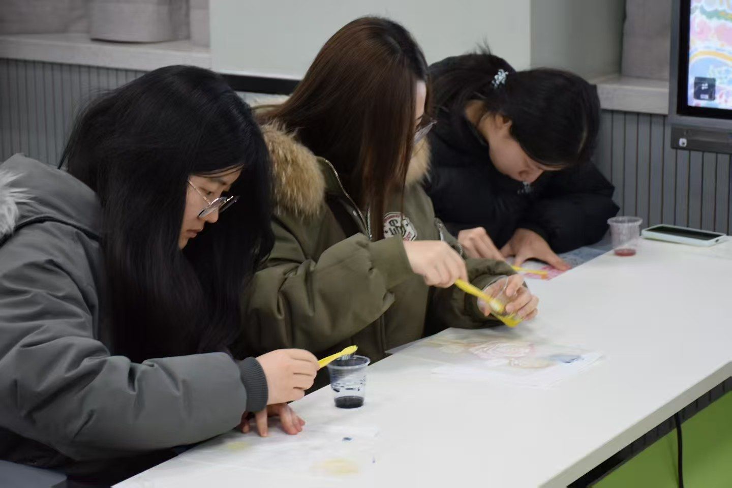实操环节将现场氛围推向高潮。在社团骨干为参与者准备了各色染料,牙刷,图案板,纯棉布料等材料,按照“选图—沾色—印刷”的流程动手创作。大家或按部就班地印刷、或另有巧思地搭配色彩、或别出心裁地绘制图案,刷毛与布料擦出独特的火花,将创意与巧思融入每一处色彩。五颜六色的染料缓缓浸润布料,晕染出独一无二的纹理,色彩交织间,自然肌理与人文匠心相映成趣。同学们沉浸其中,指尖起落间落印成纹,布料浸染间焕彩成画,在亲手创作中感受传统技艺的精妙与乐趣。