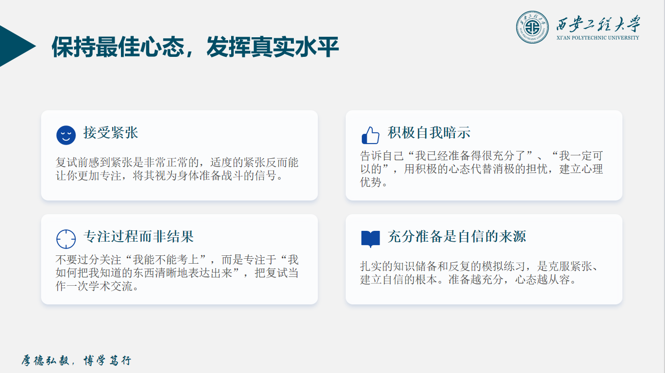 最后雷育嘉和大家分享了复试经验。她从笔试备考、面试技巧、心理调试三个方面结合自身复试经历,细致讲解了笔试重点知识点、复习方法,面试中自我介绍、专业问答、综合提问的应对技巧,以及如何缓解复试紧张情绪、保持良好心态等实用内容。