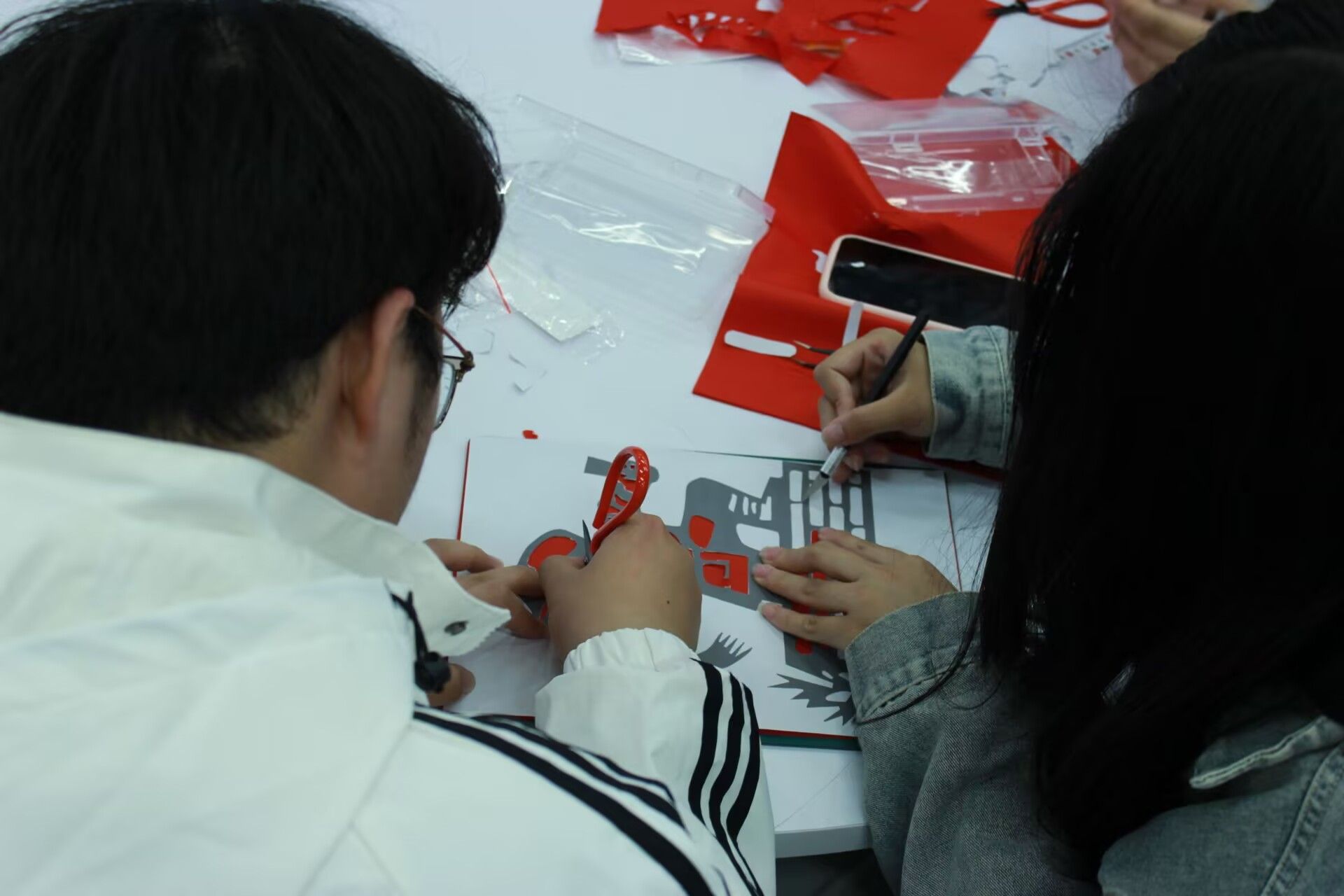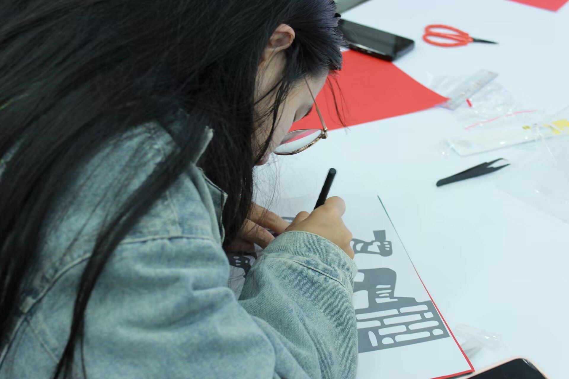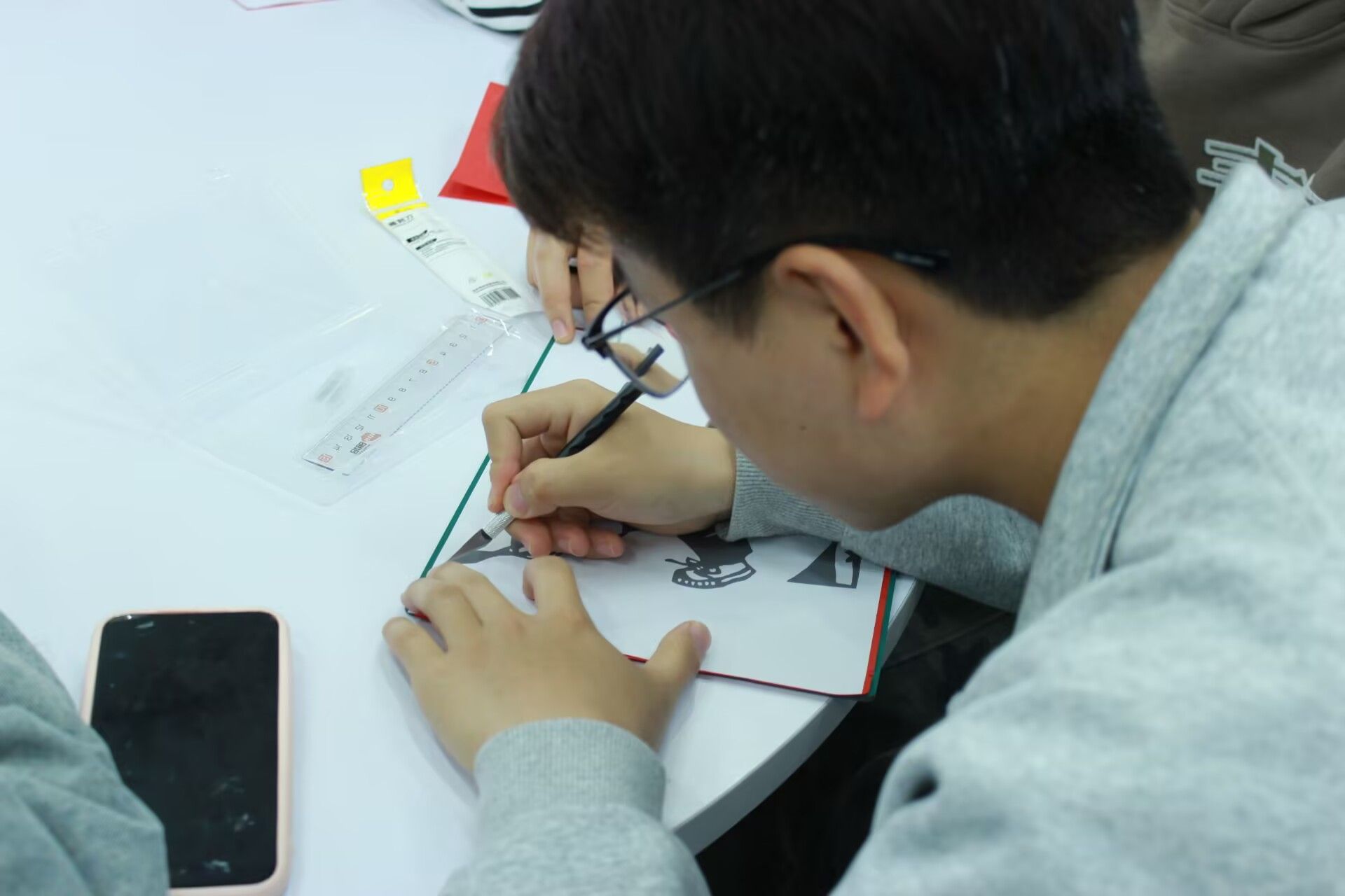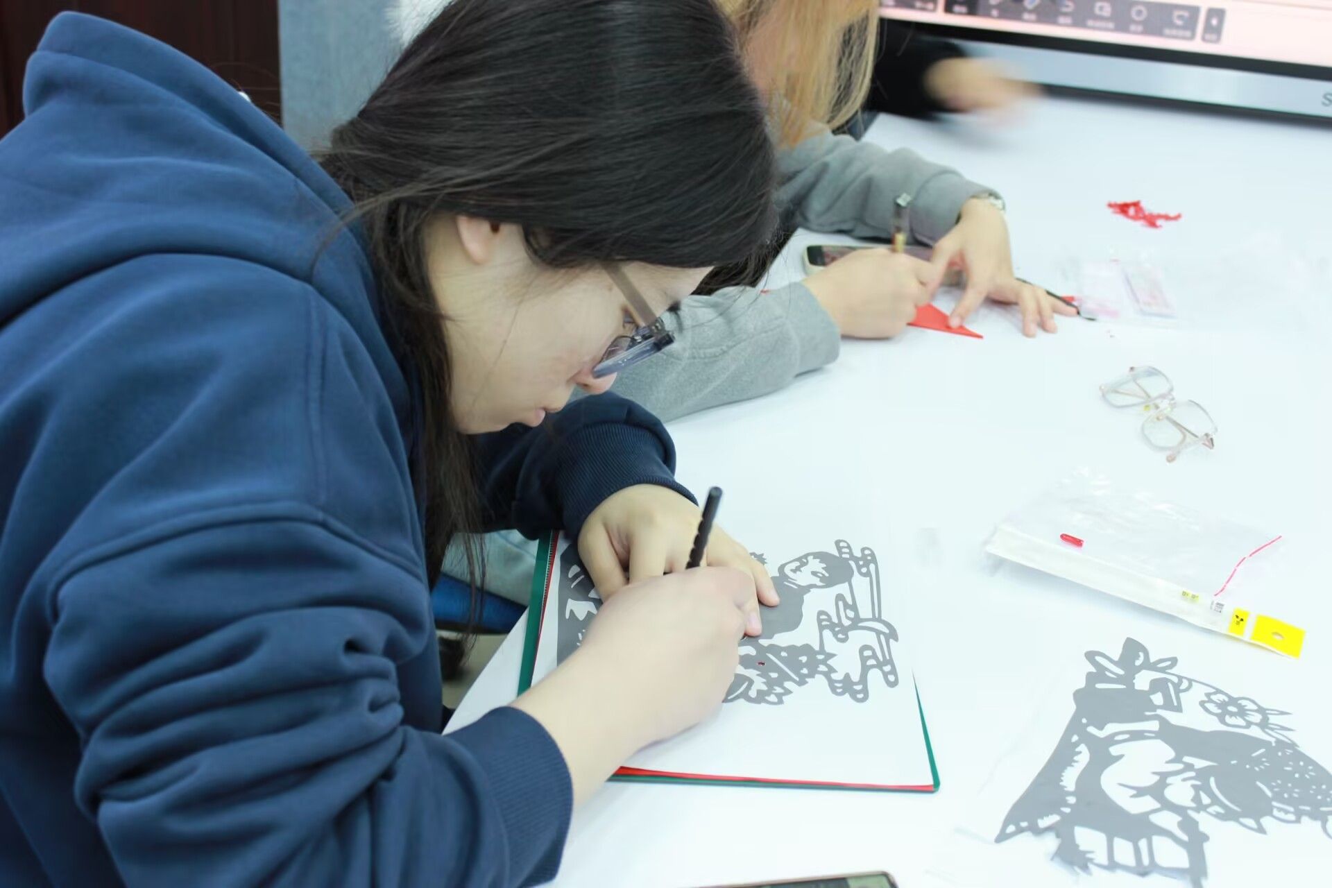 活动伊始,印染社与青协的同学共同主持,为大家介绍了清明节的传统文化内涵及活动意义。随后,印染社的同学走上讲台,详细讲解了纸刻的基本流程——图样固定、握刀姿势、运刀顺序及安全事项。同学们以四人一组领取刻刀、垫板、红宣纸及英烈主题图样,在印染社与青协成员的指导下开始创作。